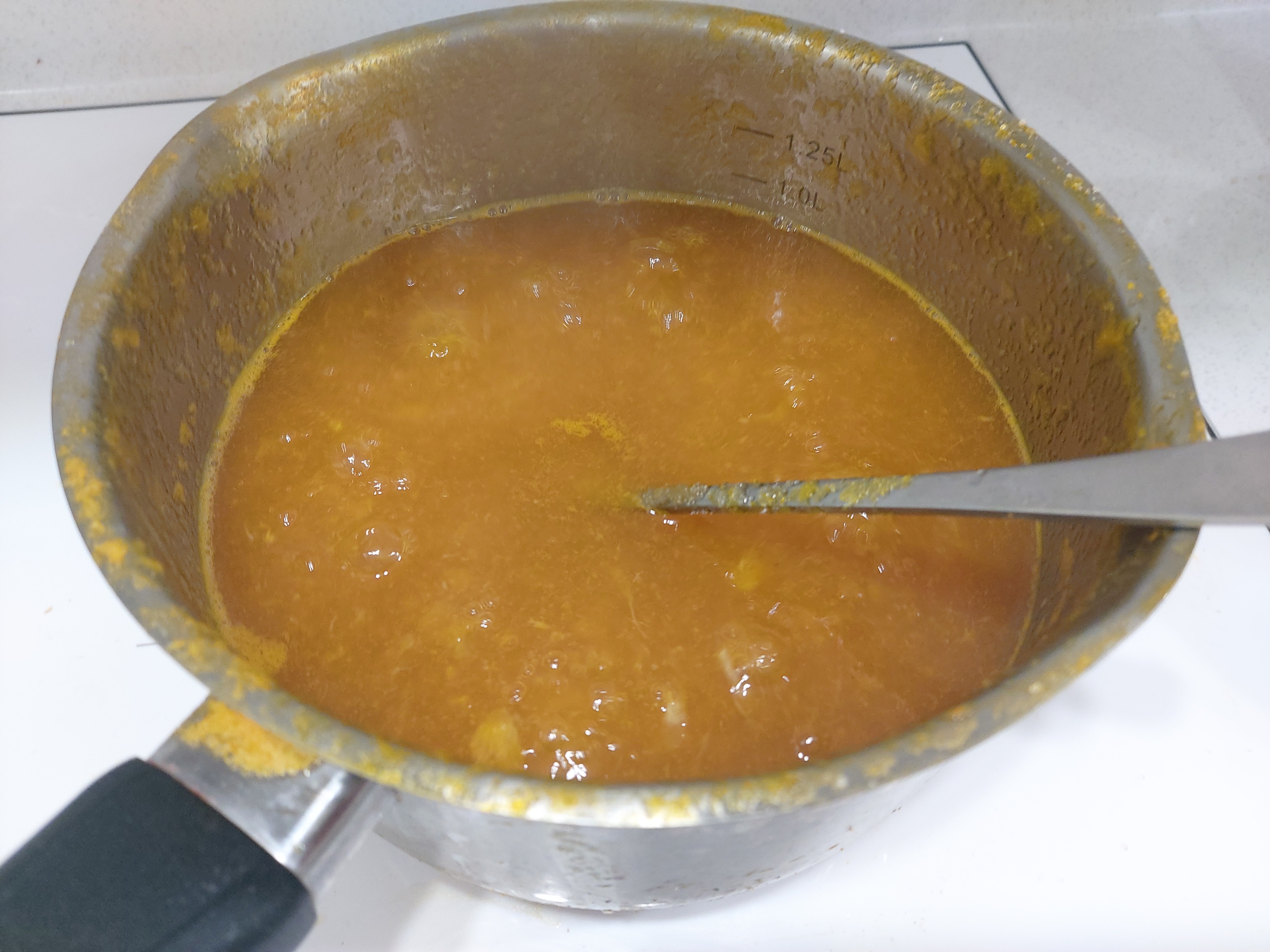 처음 시작할때 냄비에 700ml 내외의 분량이 들어갔는데 이게 500ml 정도로 줄어들때쯤 끄면 되더라.