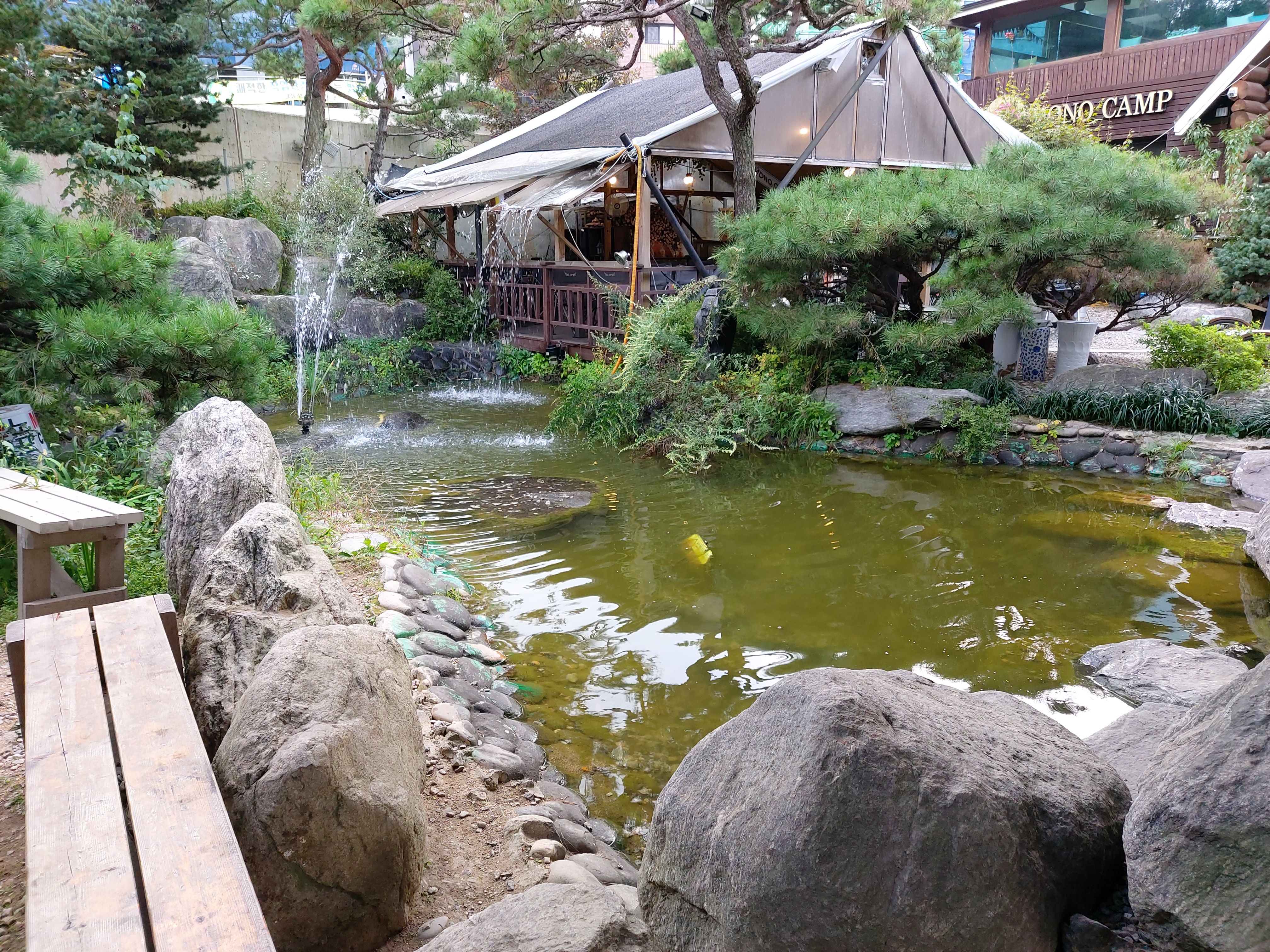 중간에 큰 연못이 하나 있고 그 주위로 테이블들이 깔려있다.