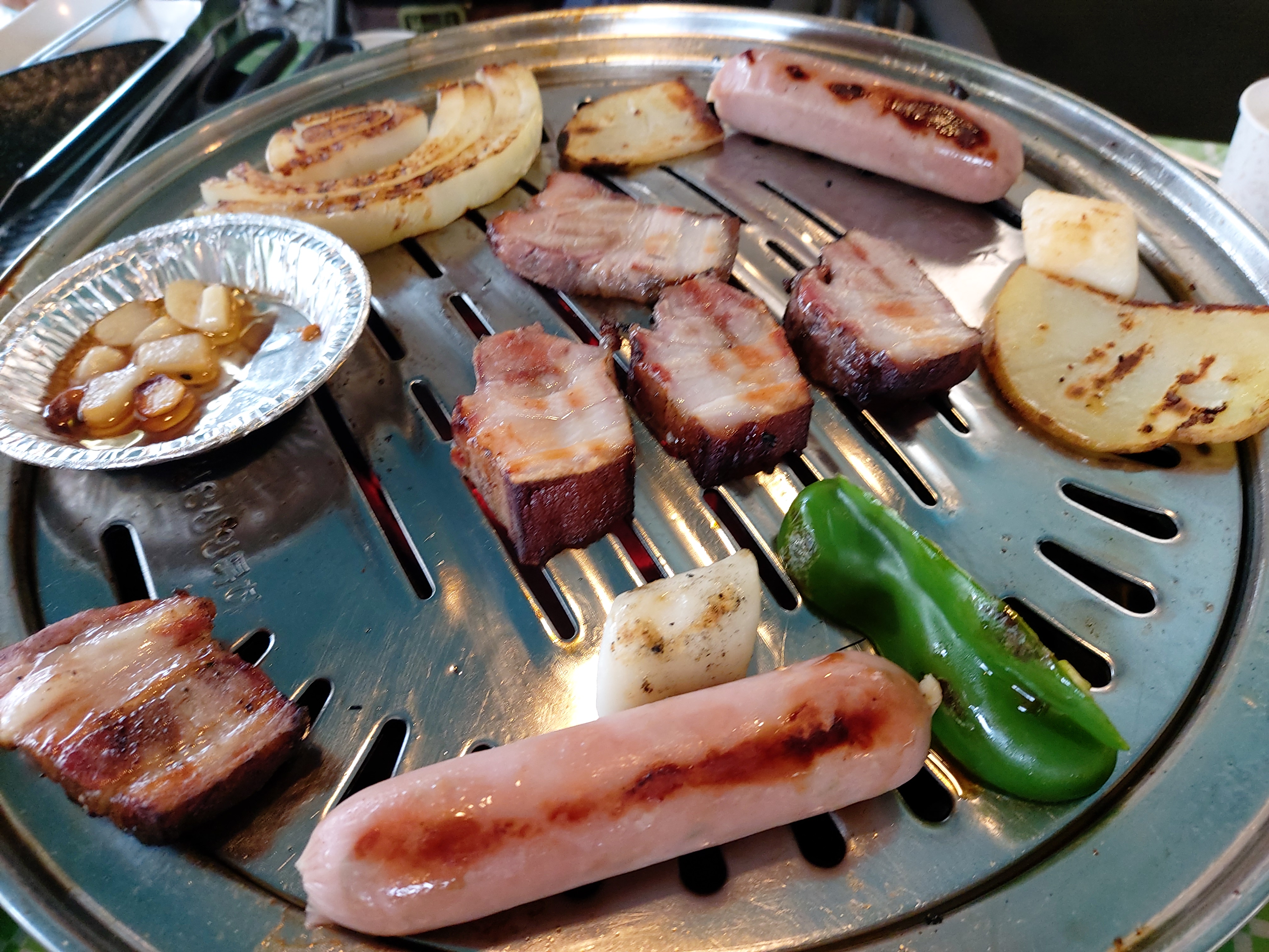 그래서 다음 훈제고기를 굽고 소세지도 올리고 다른 야채들도 또 올려서 구워먹는중. 훈제고기도 맛있었다.