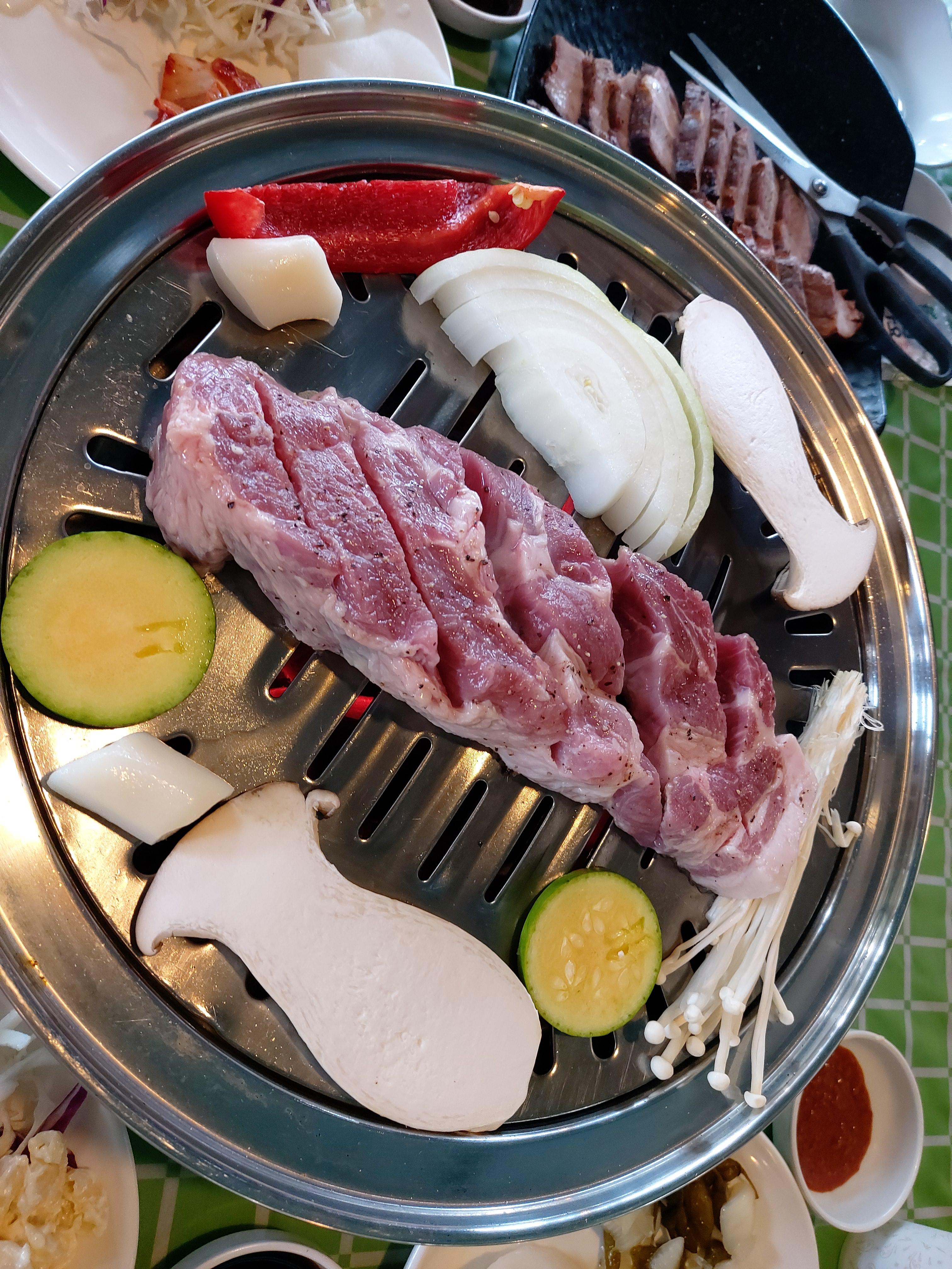상추나 쌈무, 야채 샐러드 김치 같은 기본안주는 와서 직접 가져가면 되는 셀프바 시스템으로 운영하고 있어서 먹고싶은 만큼 가져가면 된다. 귀찮다고 너무 많이 담아가면 다 못먹고 남기니 적당히 가져가서 먹는걸 추천한다.