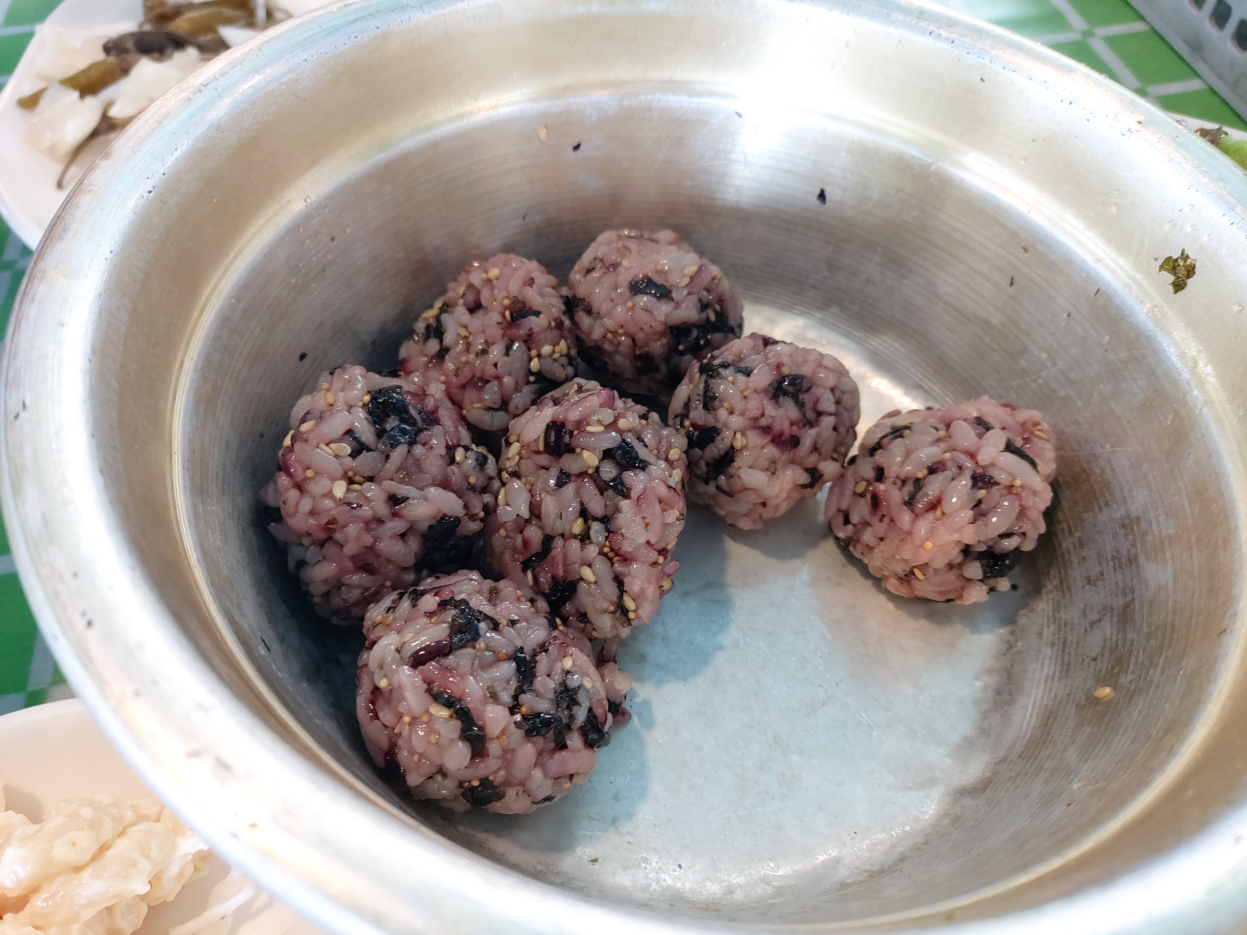 주먹밥은 잡곡밥 베이스였는데 이거 그냥 먹어도 괜찮지만 고기 구울때 옆에서 같이 구워도 맛있었다!!