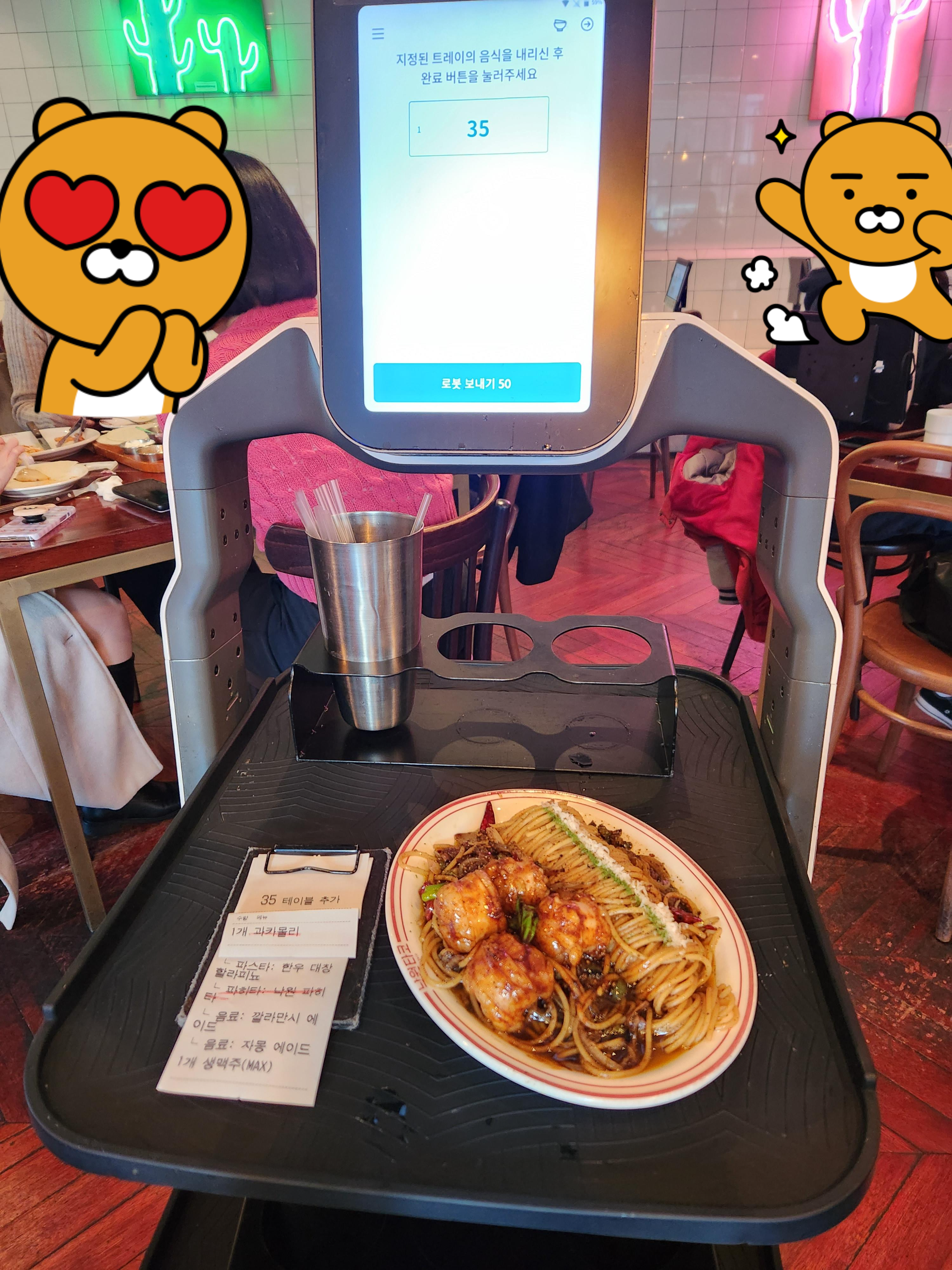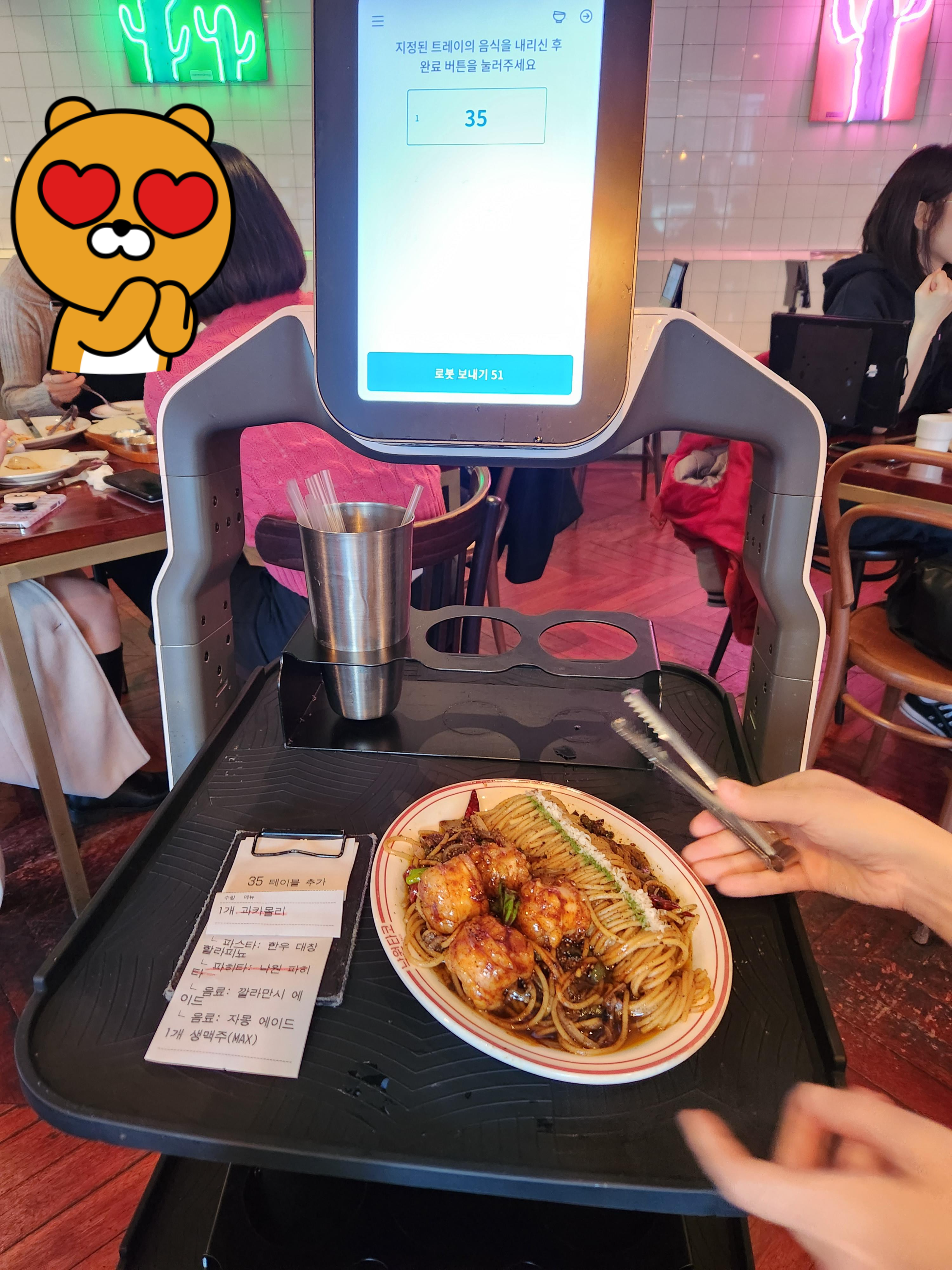 파히타는 직원이 직접 와서 가져다주고 불 붙여주면서 설명을 해줬는데 파스타는 음료와 동일하게 로봇이 서빙을 해줬다.