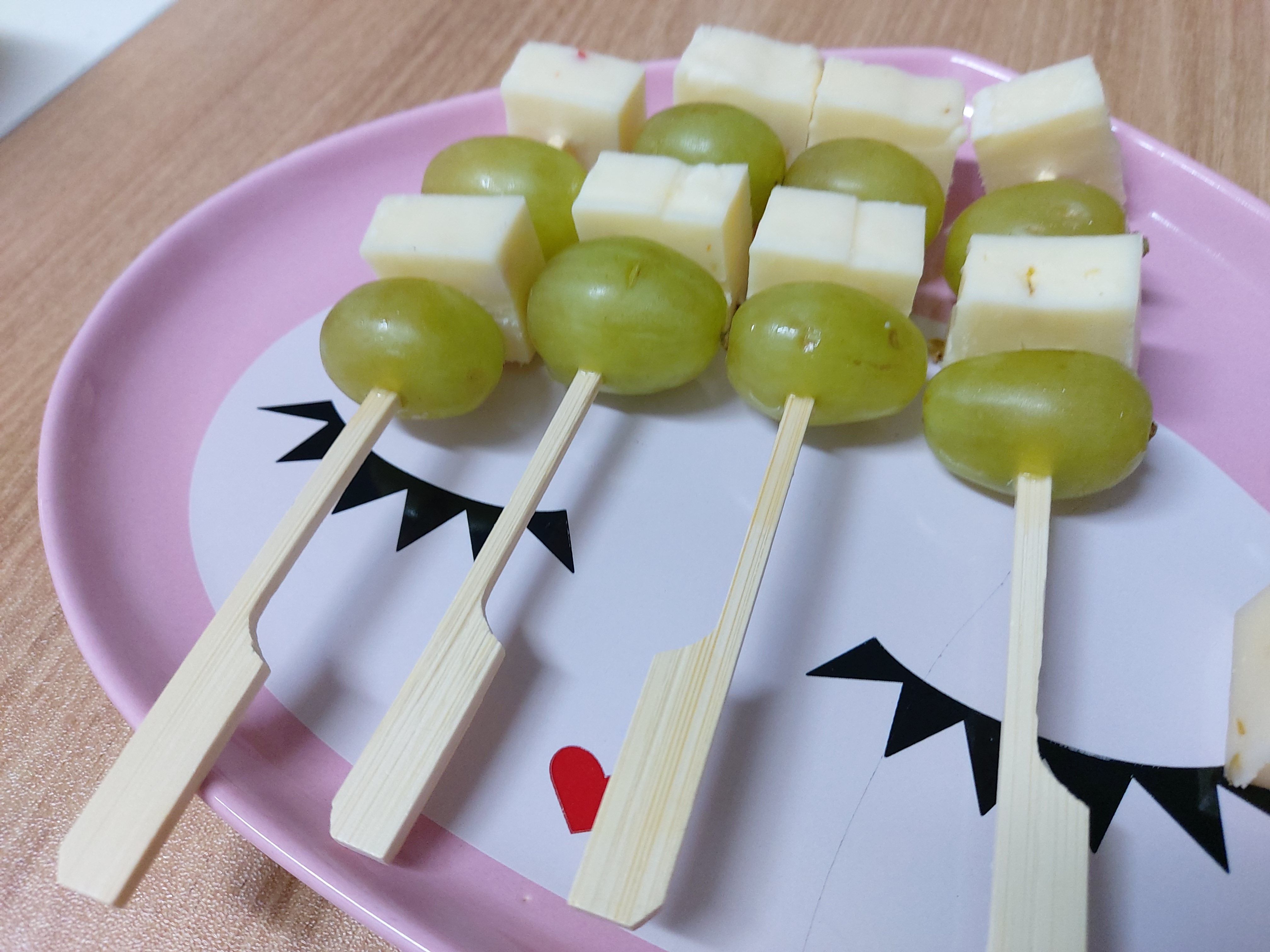 고기만 있어도 충분하지만 왠지 좀 아쉬워서 만든 치즈+청포도 꼬치. 치즈는 페퍼잭 치즈라서 그냥 잘라놓고 먹기만 해도 괜찮지만 과일이 있으면 단맛도 추가돼서 더 괜찮지 않을까 하고 만들었다.