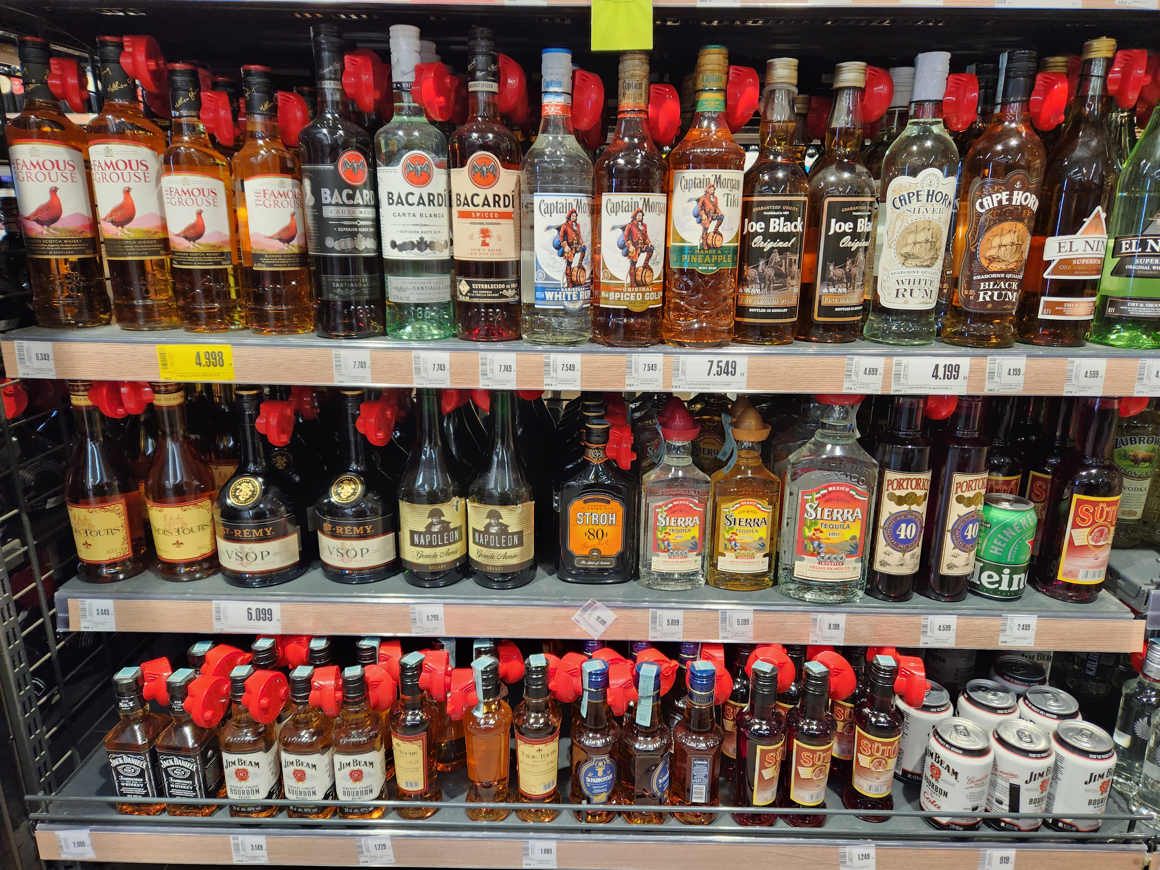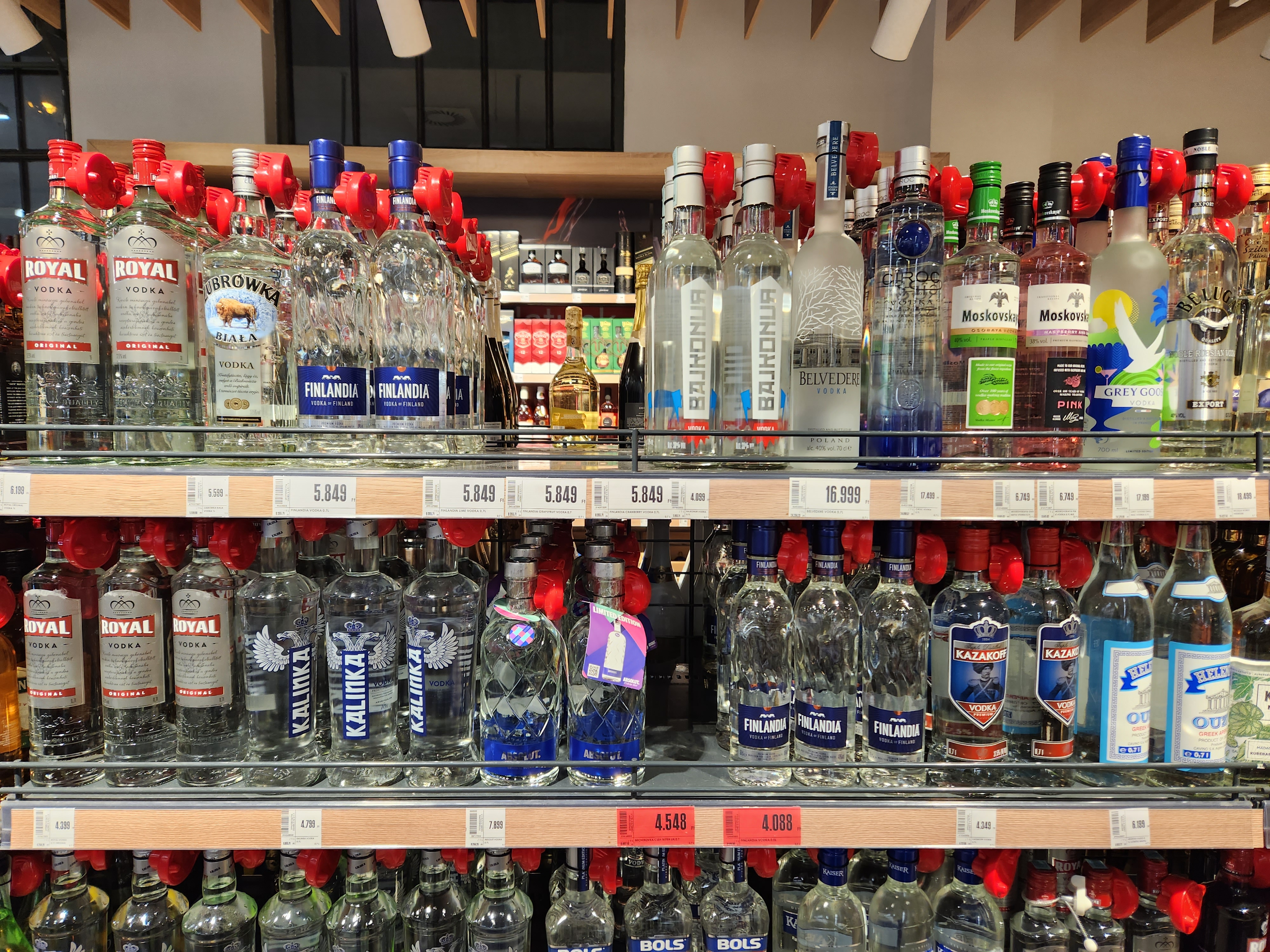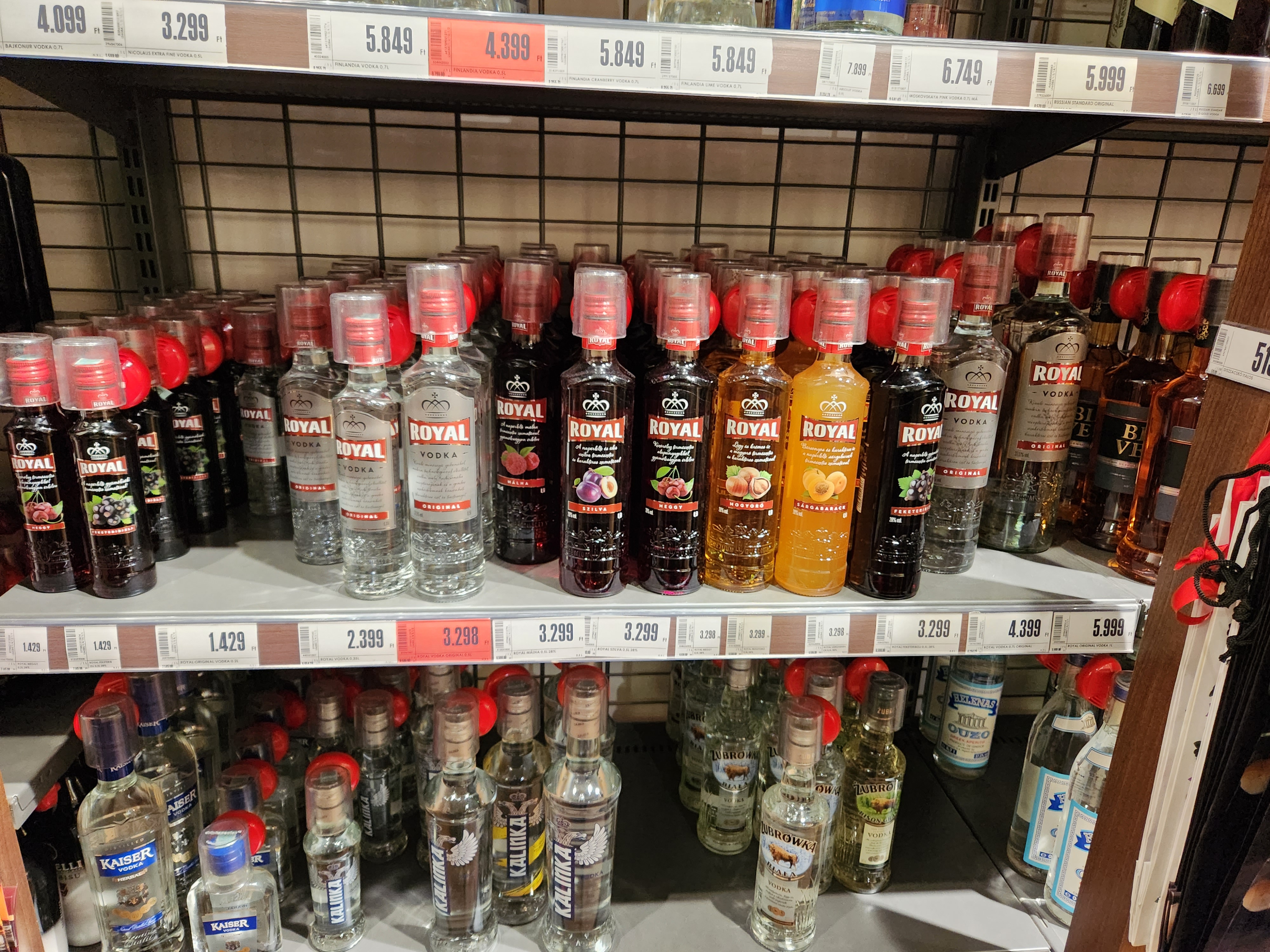 보드카도 종류가 이렇게 다양할 수가 없었따. 옆에 벨루가도 살짝 보이는데 러시아와 가까워서라도 제법 비싸지 않은 가격일거다. 못보던 보드카도 많아서 싸다 비싸다를 논하기엔 어렵지만 대충 본 가격들이 x3을 해서 봐도 한국보다는 훨씬 싼 것 같다.
