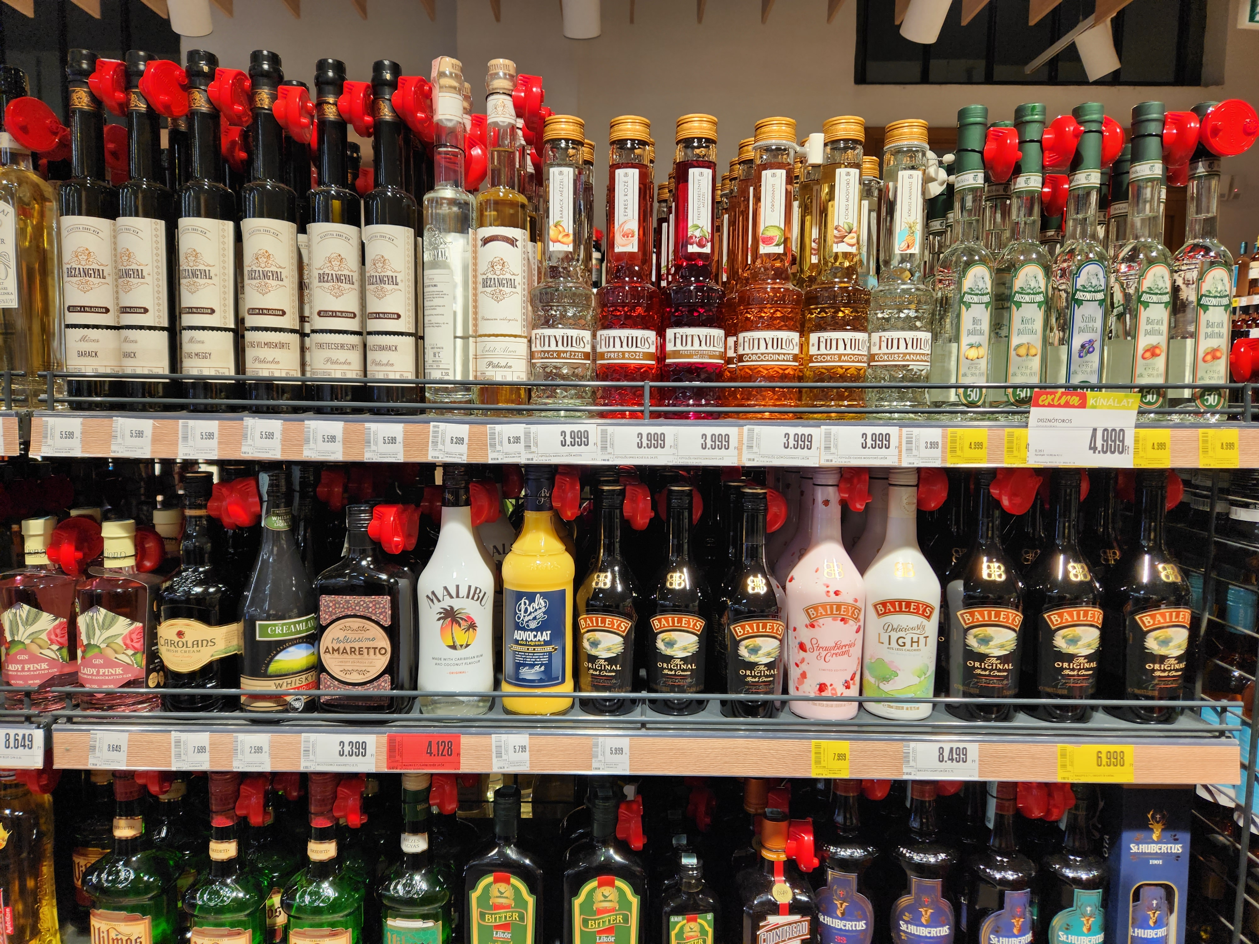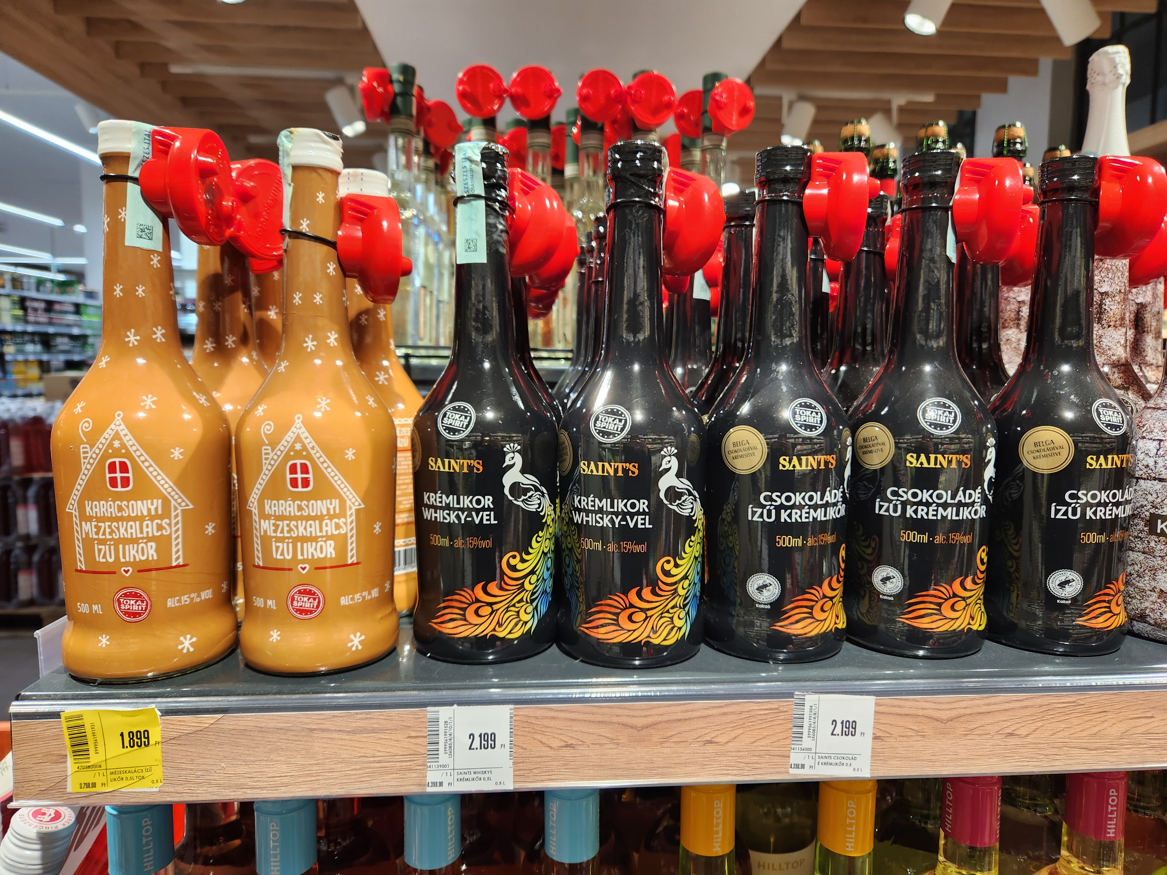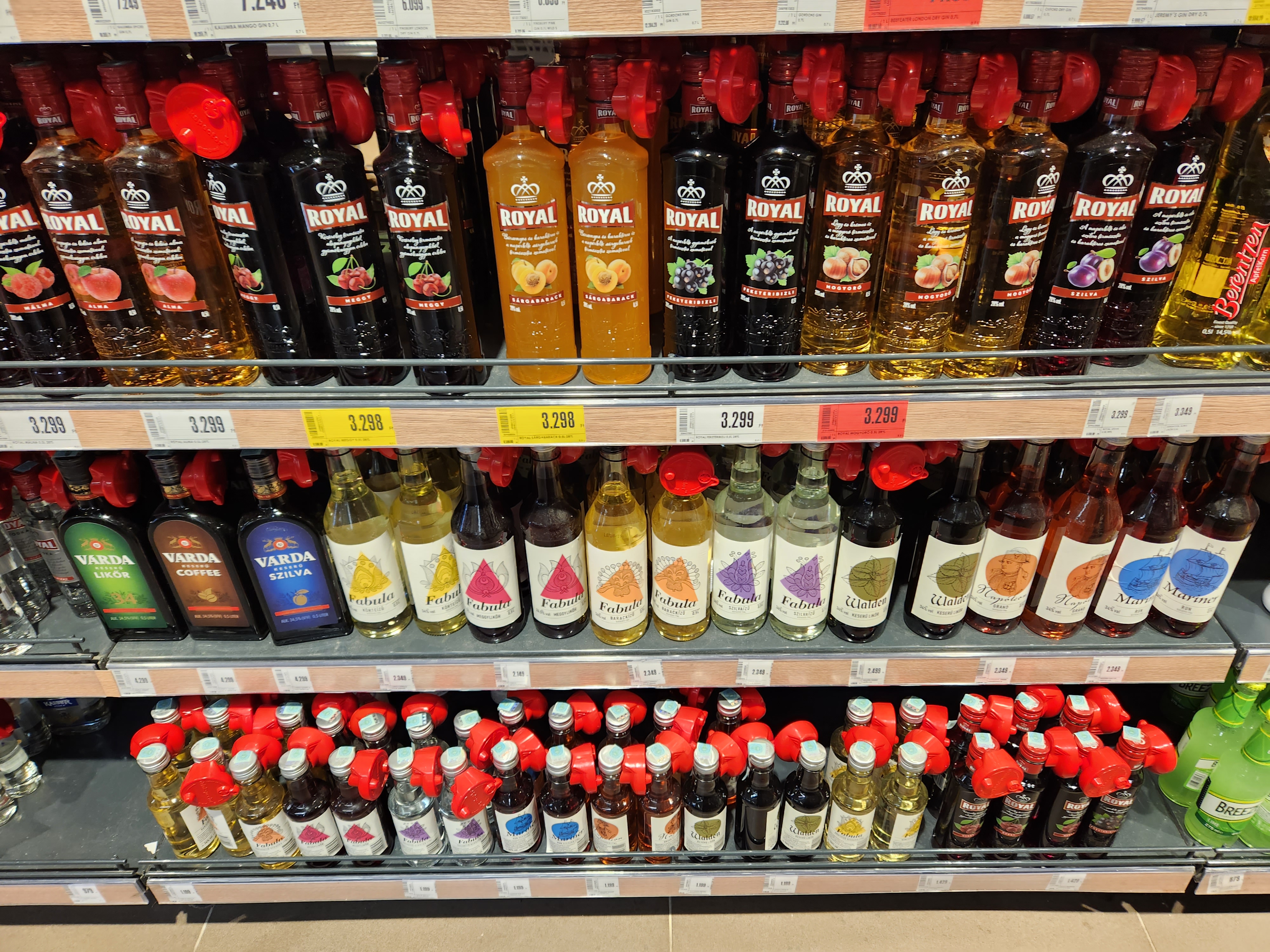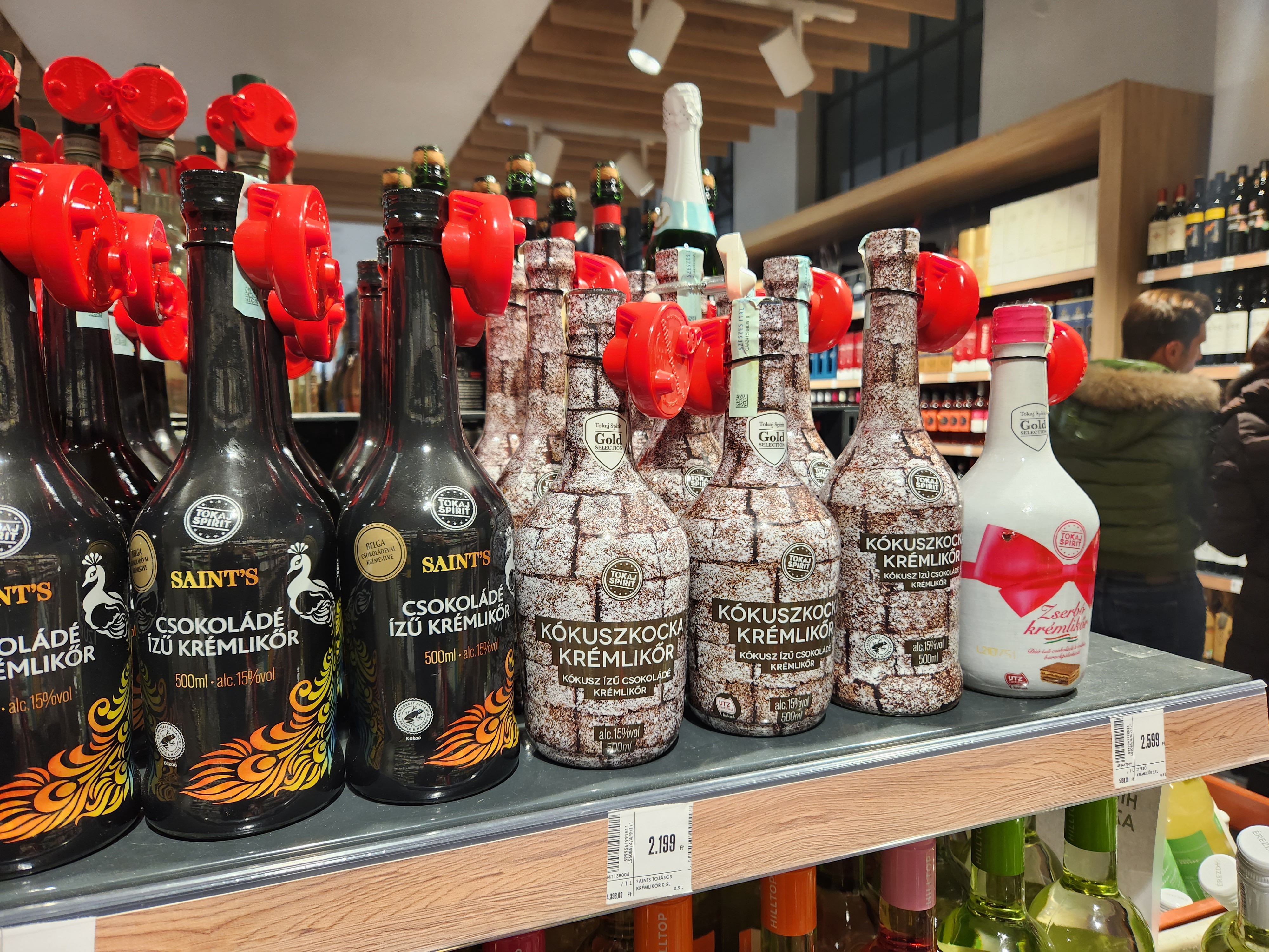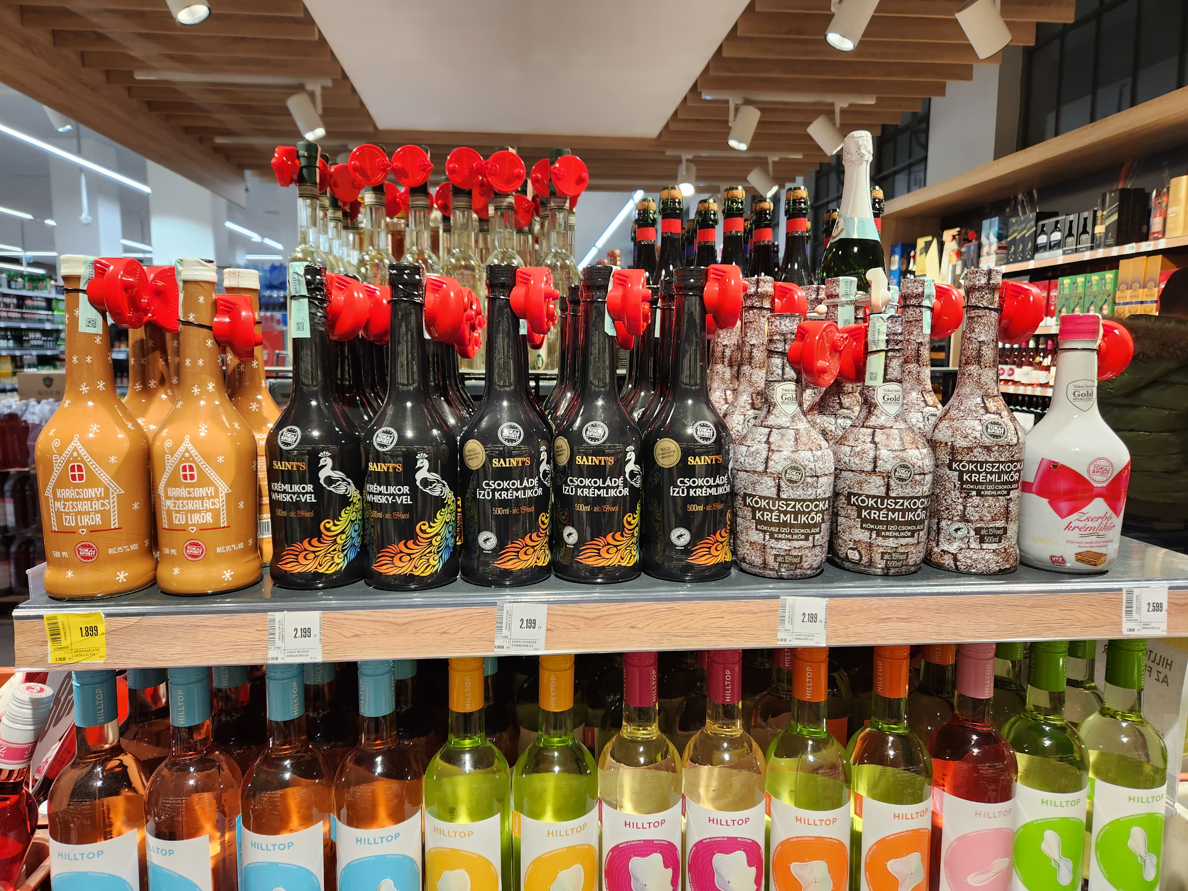 위에 있는 술이 일반적인 술이라면 중간중간 팔린카(헝가리 전통주 중 한가지)로 보이는 술들도 있었다. 보드카에 향을 넣은 것도 비슷하게 보일 수 있지만, 유독 종류가 다양하고 여러가지 과일 그림(특히 자두,살구,포도 같은 과일들)이 있다면 혹시 이게 팔린카?! 하면서 봐도 될 것 같다. 잘 보면 PALINKA 라고 써있다.