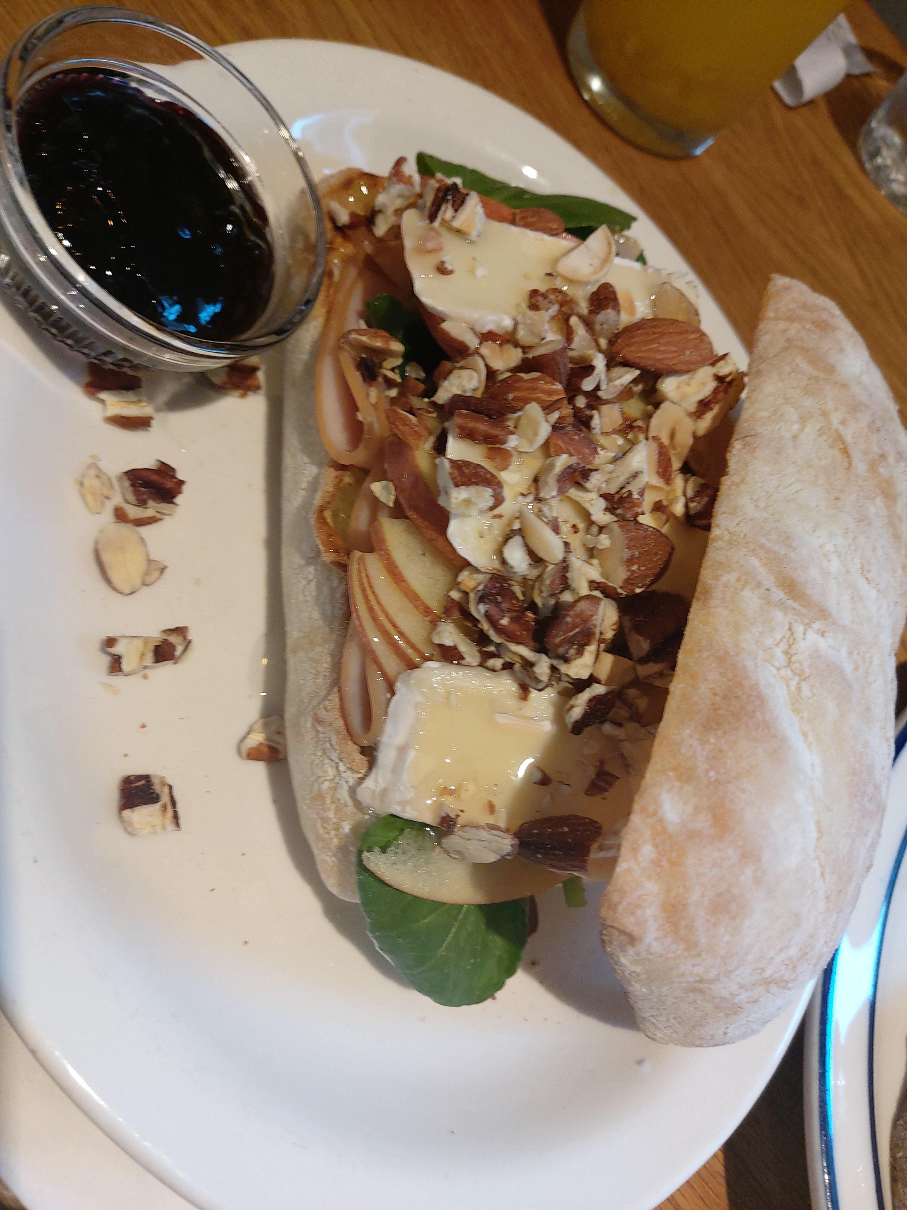 사과와 브리치즈는 당연히 괜찮은 조합이었고 견과류도 뿌려져있어서 브리치즈구이가 생각나는 모양이었다. 이걸 빵위에 끼얹으면 이런 느낌이 되는구나 싶었다.
