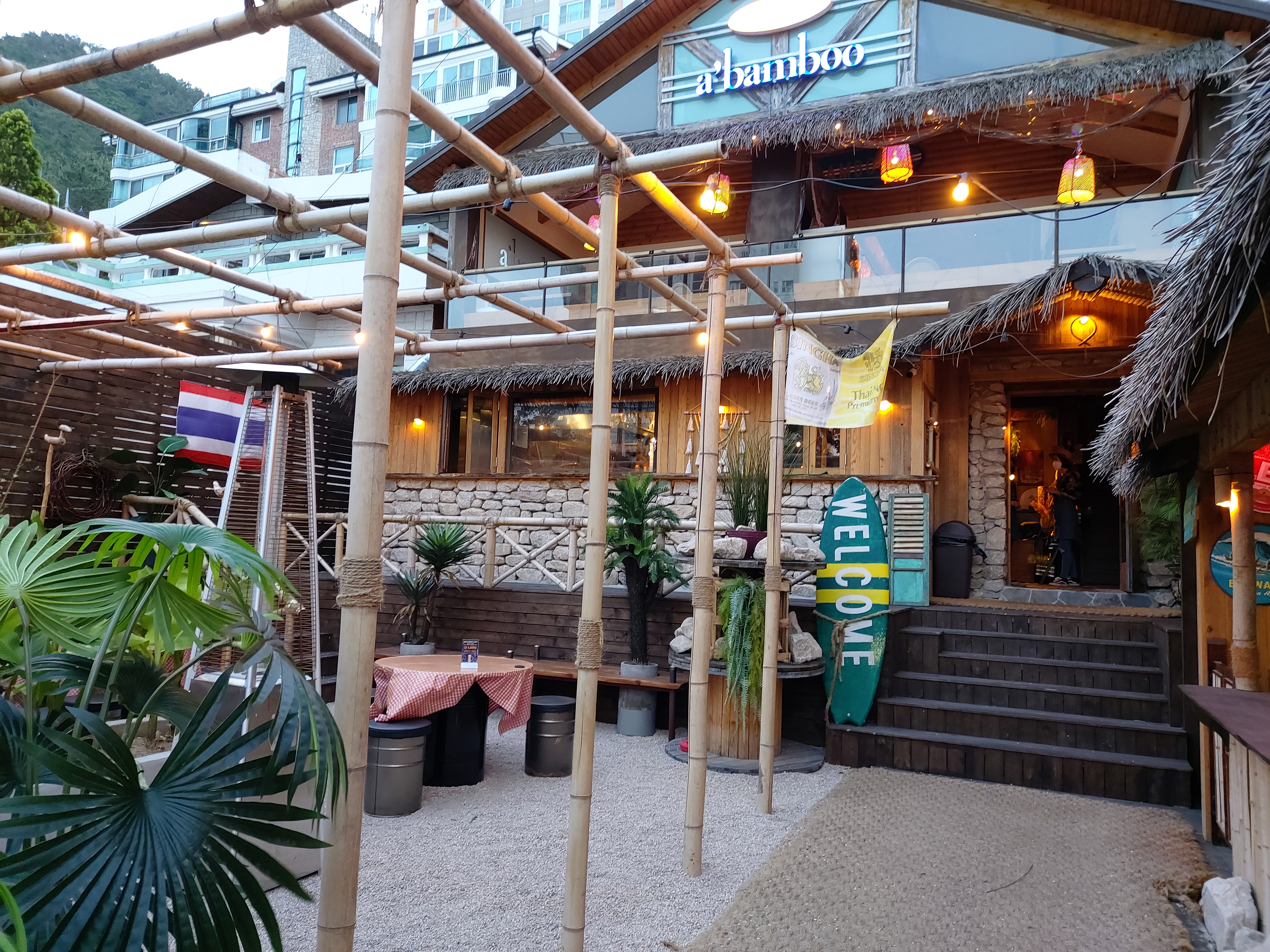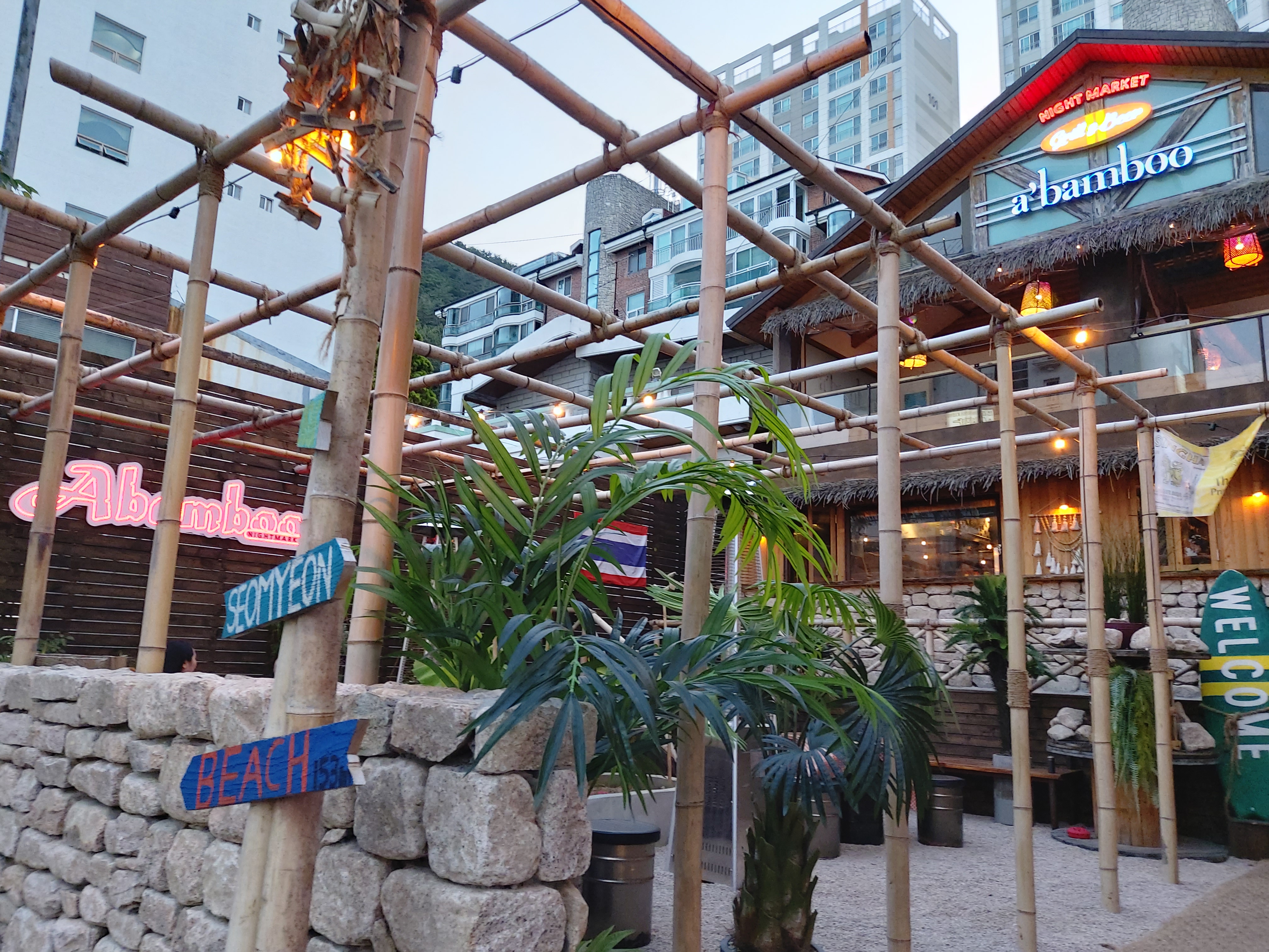 송정에 유명한 맛집인듯한 어밤부, 위치는 흑송에서 조금 더 안쪽으로 들어가면 있는데, 갈때마다 대기가 너무 길거나 짤려서 들어가지 못했다. 그러다 묵던 호텔 바로 앞에 있는 독특한 분위기의 건물은 대체 뭔가 하고 찾아봤는데 그게 어밤부 나이트마켓이길래 여긴 다른 분위기려나? 하고 방문하게 된 곳.
