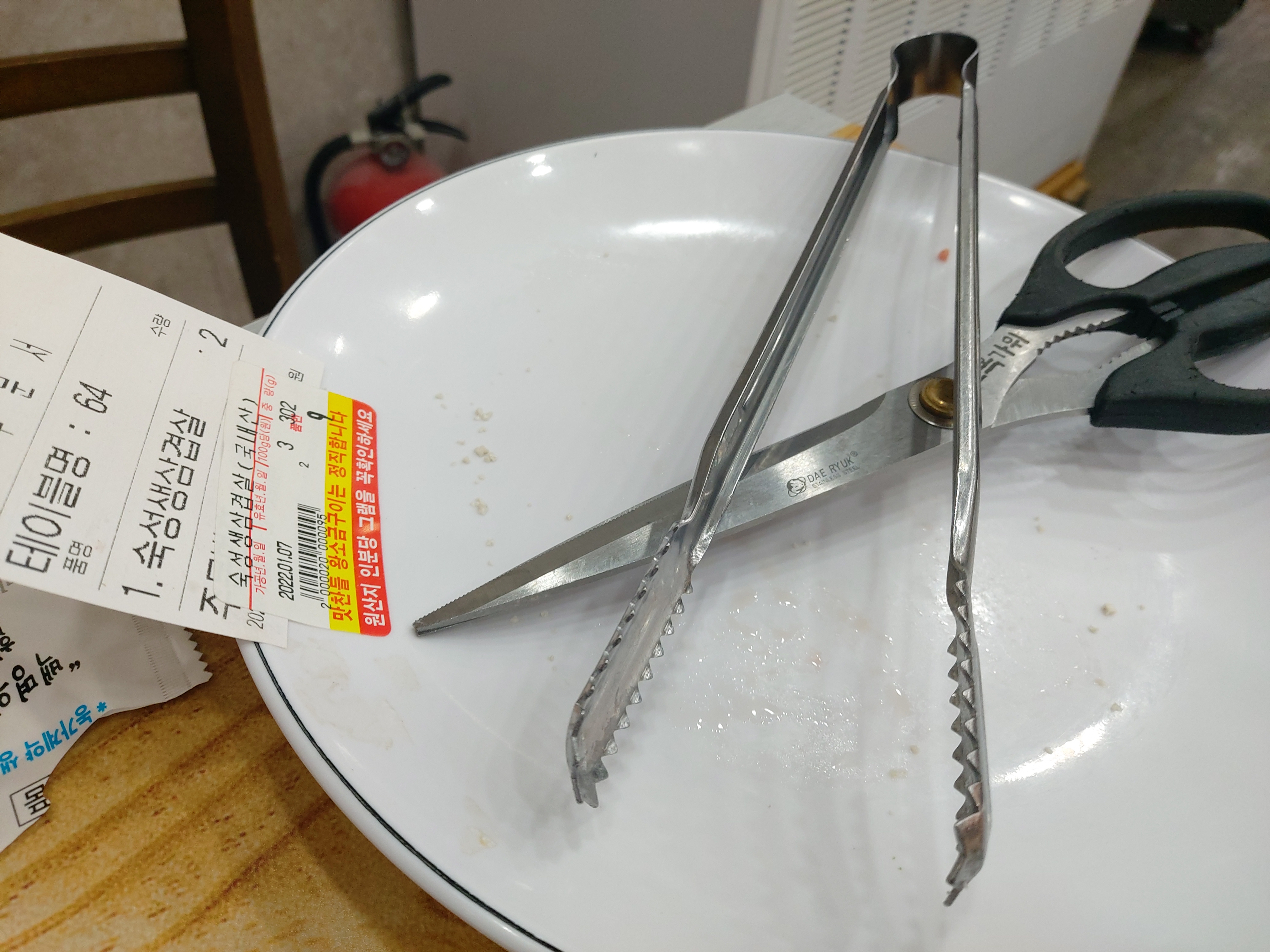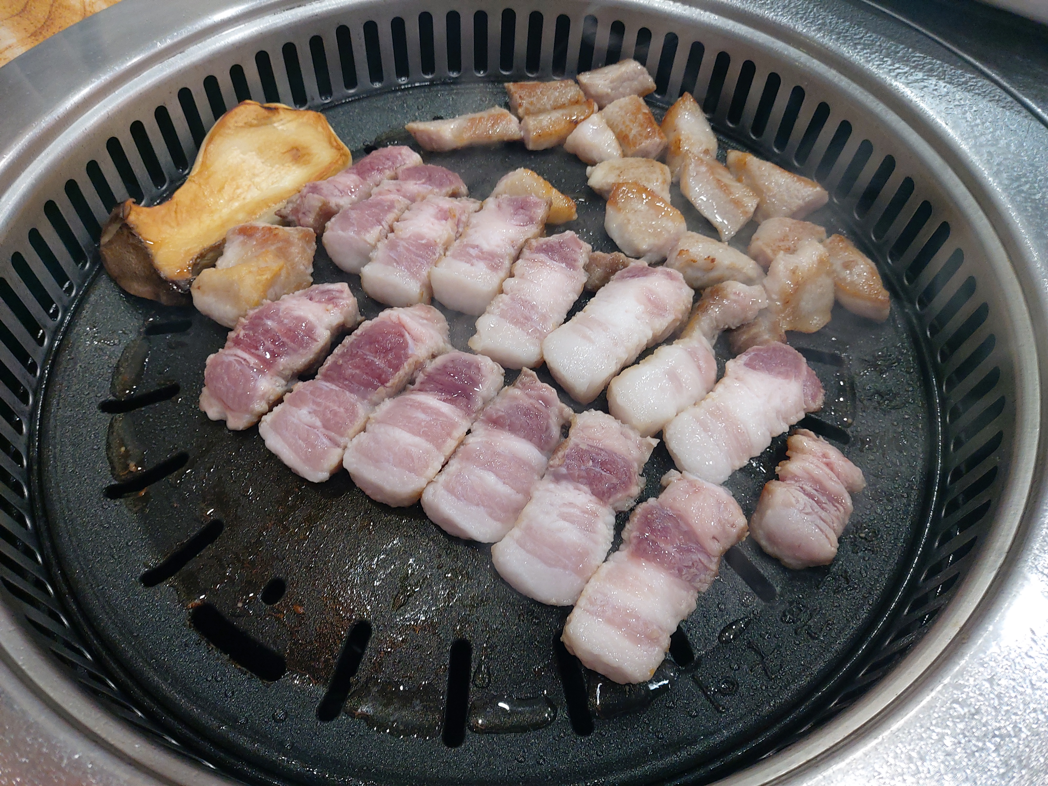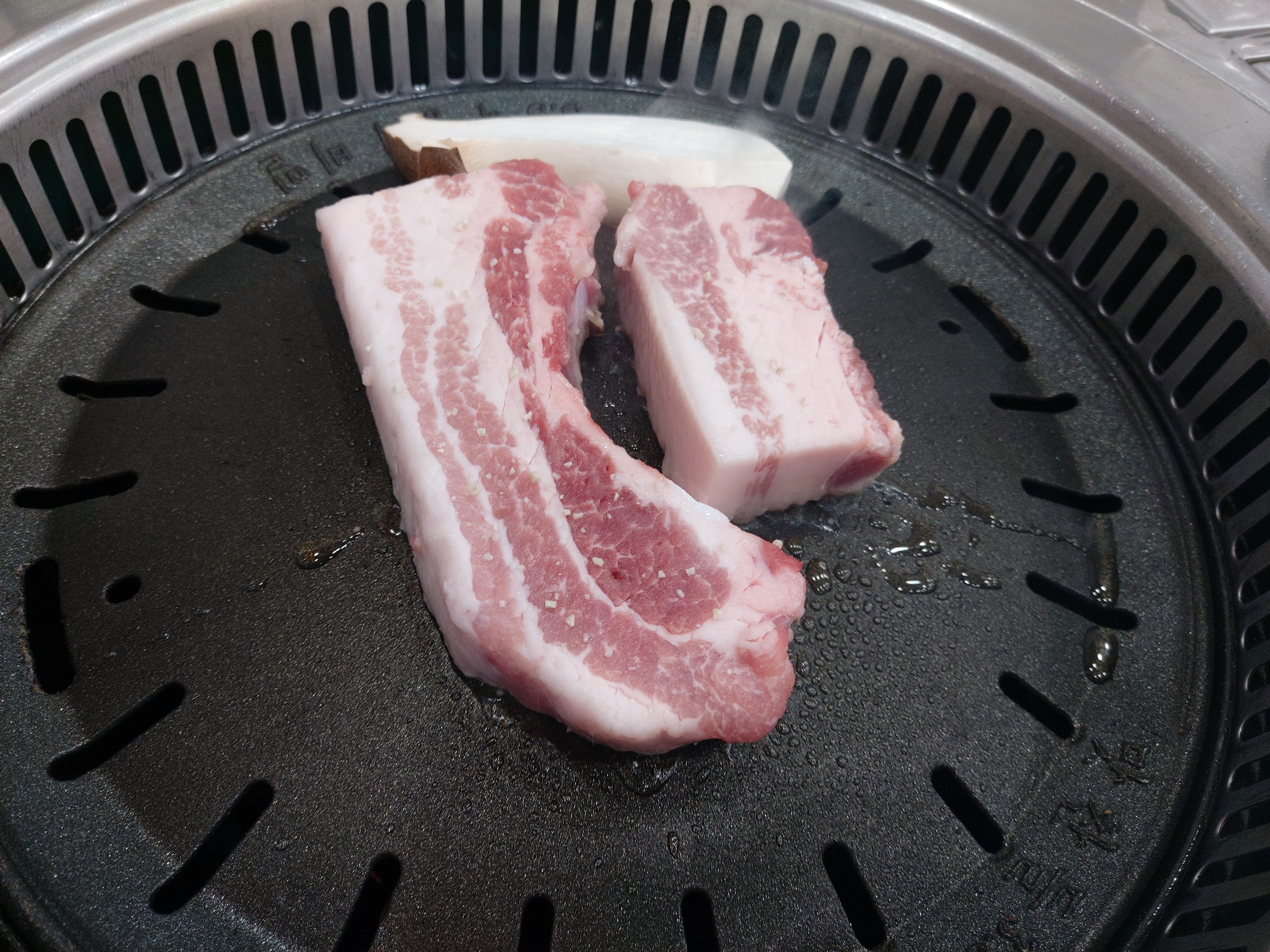삼겹살만 2인분을 주문했다가 왠지 부족할 것 같아서 항정살 1인분을 추가해서 한번에 구웠다. 고기가 있는 접시에 그람수가 표시되어있어서 왠지모를 만족감(?)이 느껴진다.