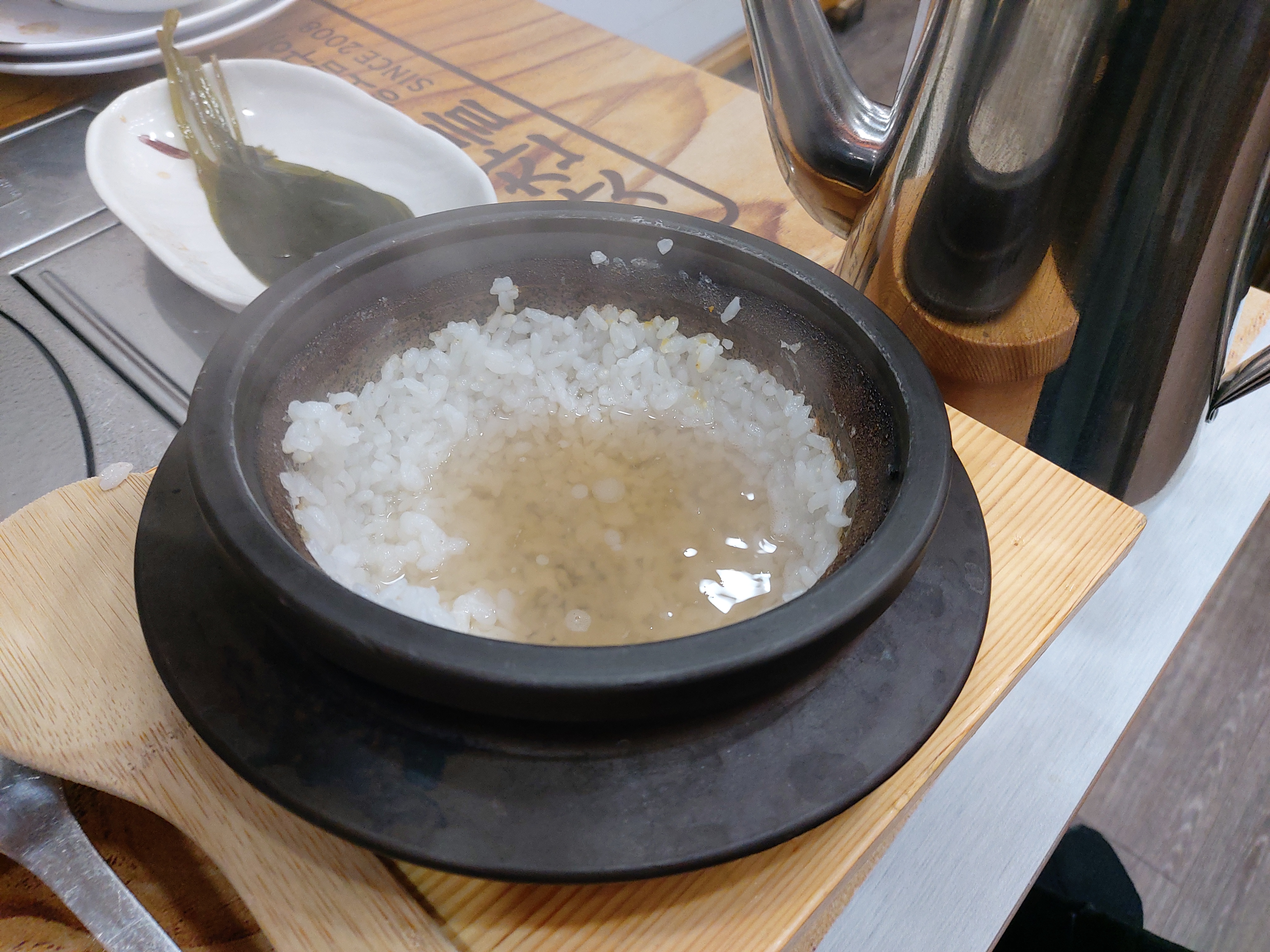 돌솥밥은 역시 다 먹고 뜨거운 물을 부어서 누룽지도 먹는게 메인인 것 같다. 이걸 먹기 위해 돌솥밥을 주문했다. 처음에 물을 조금 덜 넣은 건지 물이 덜 끓은건지 제대로 안되어서 조금 아쉽긴 했지만 누룽지맛을 보기엔 충분했다. 고깃집에서 돌솥밥은 처음 시켜봤는데 다음엔 밥이 나오기 직전에라도 고기추가까지 해서 밥이랑 같이 먹겠다는 각오를 다졌다.