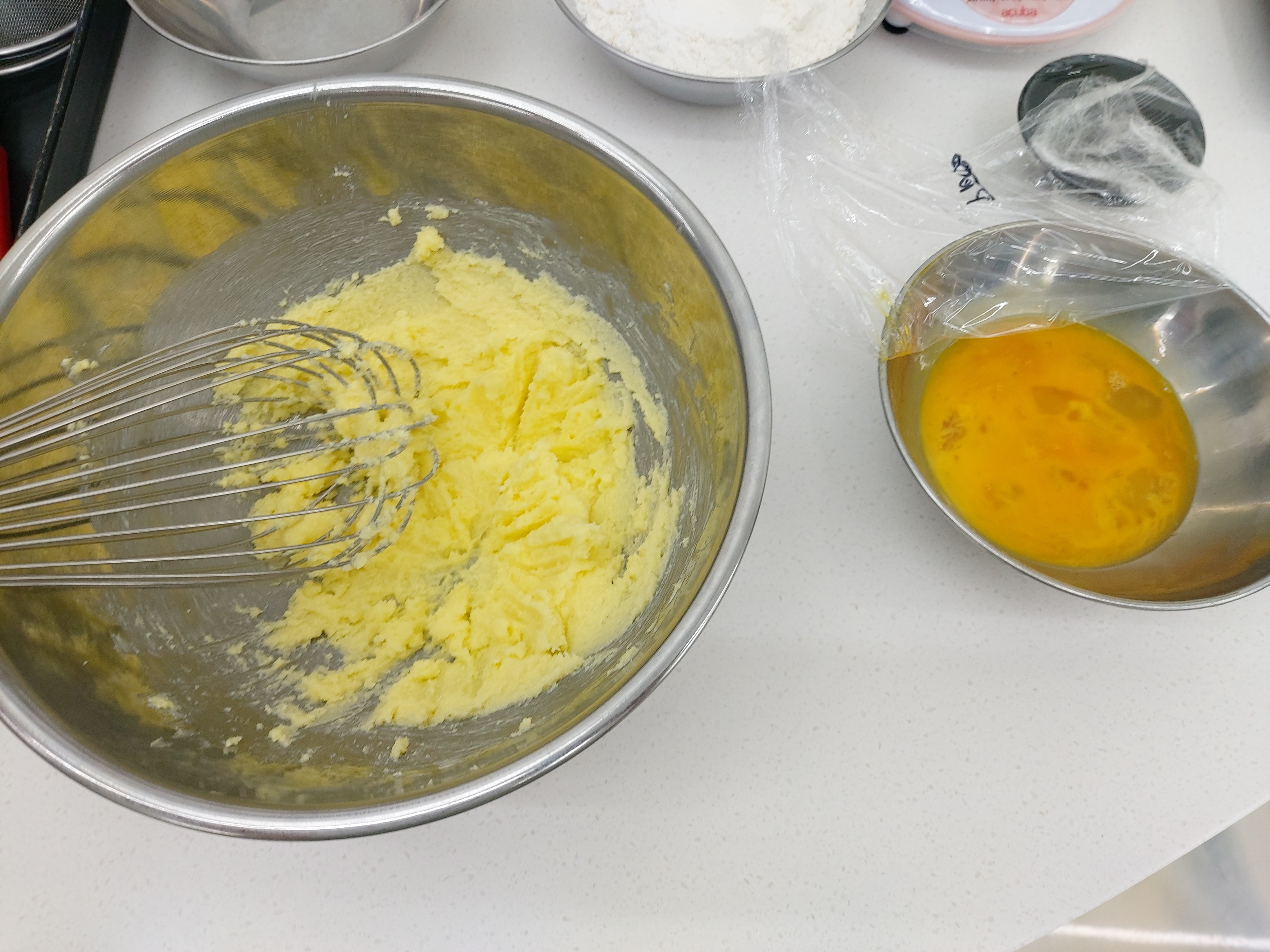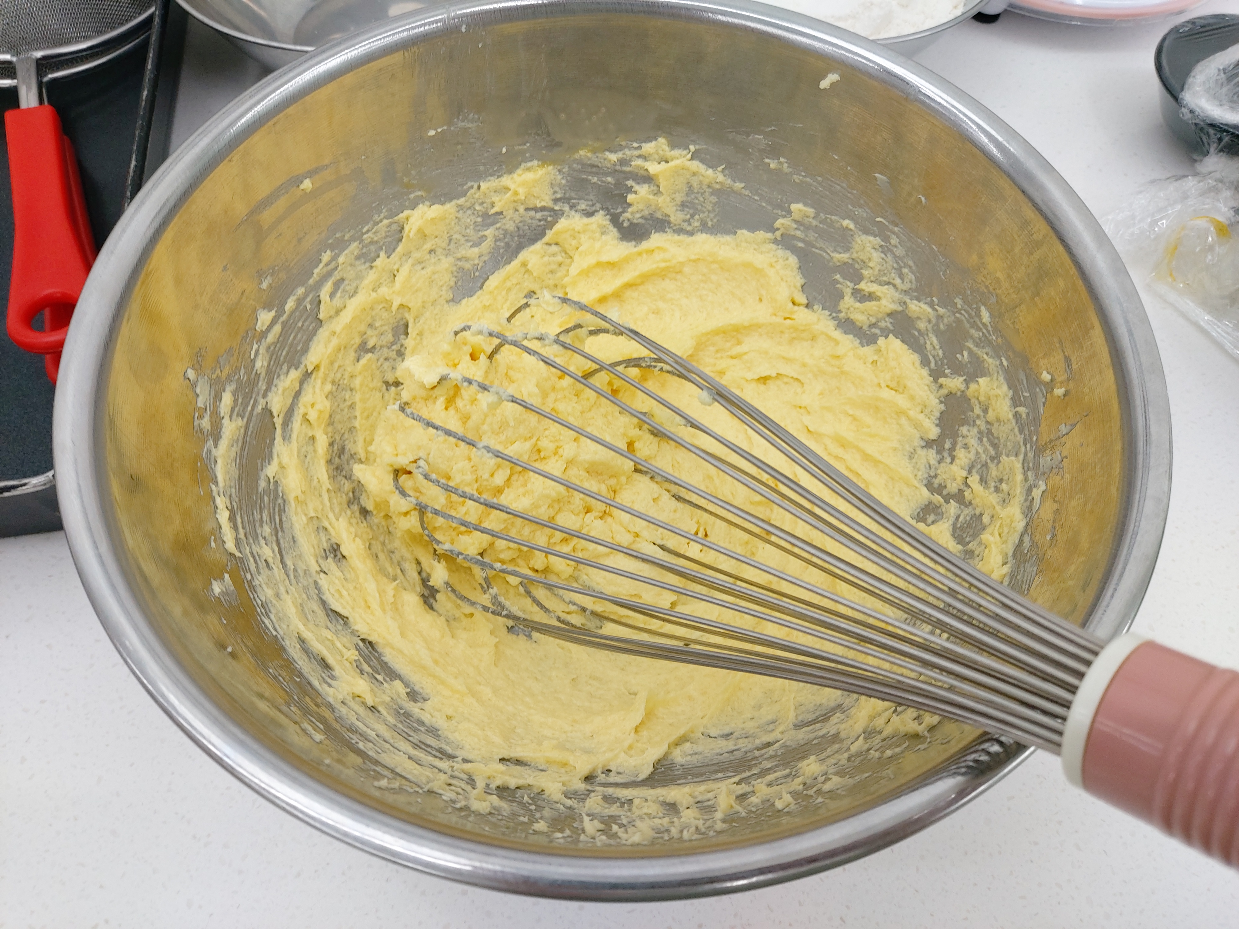 일단 상온에 둔 버터를 풀어주는 과정. 그리고 계란을 넣고잘 풀어준 뒤에 가루류 재료들도 체쳐서 넣어주고 열심히 반죽을 한다.