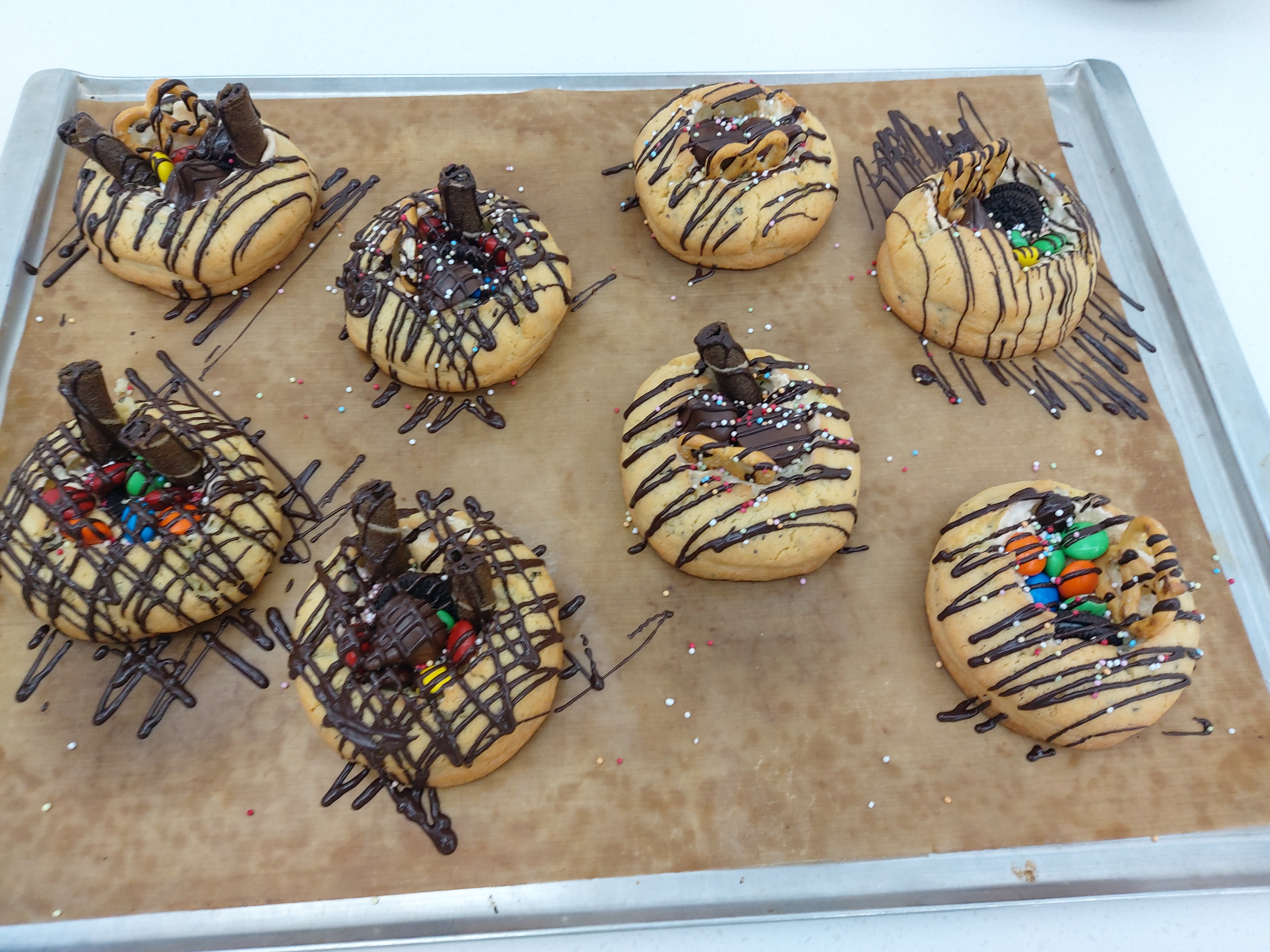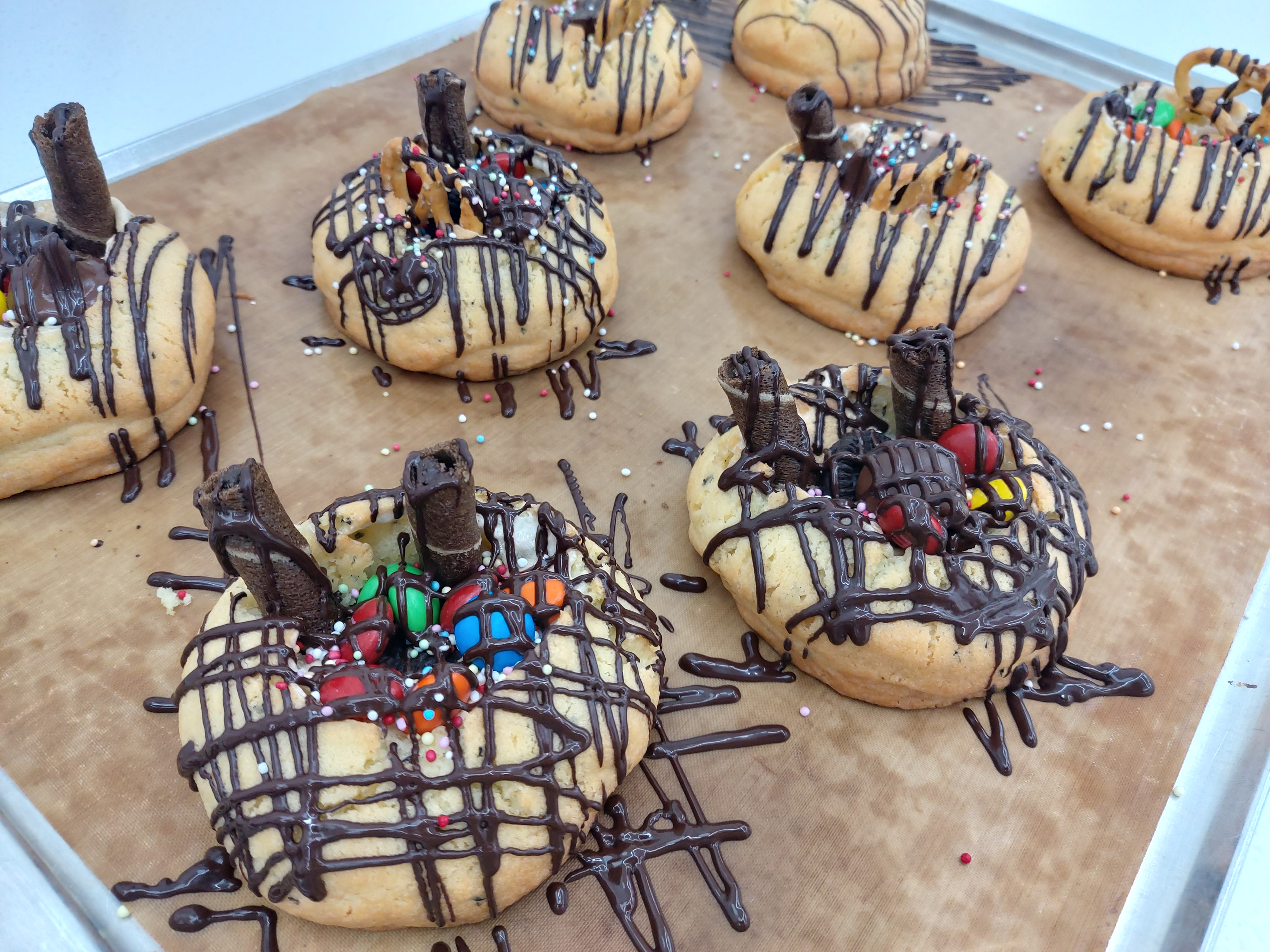 준비해준 재료를 정말 아끼없이 다 넣었더니 과자가 터질것같은 상태가 됐다. 심지어 그와중에 중탕한 초콜렛도 받아서 위에 열심히 뿌렸더니 딱 봐도 과자 하나하나가 칼로리폭탄일 것 같은 모양새가 되었다.