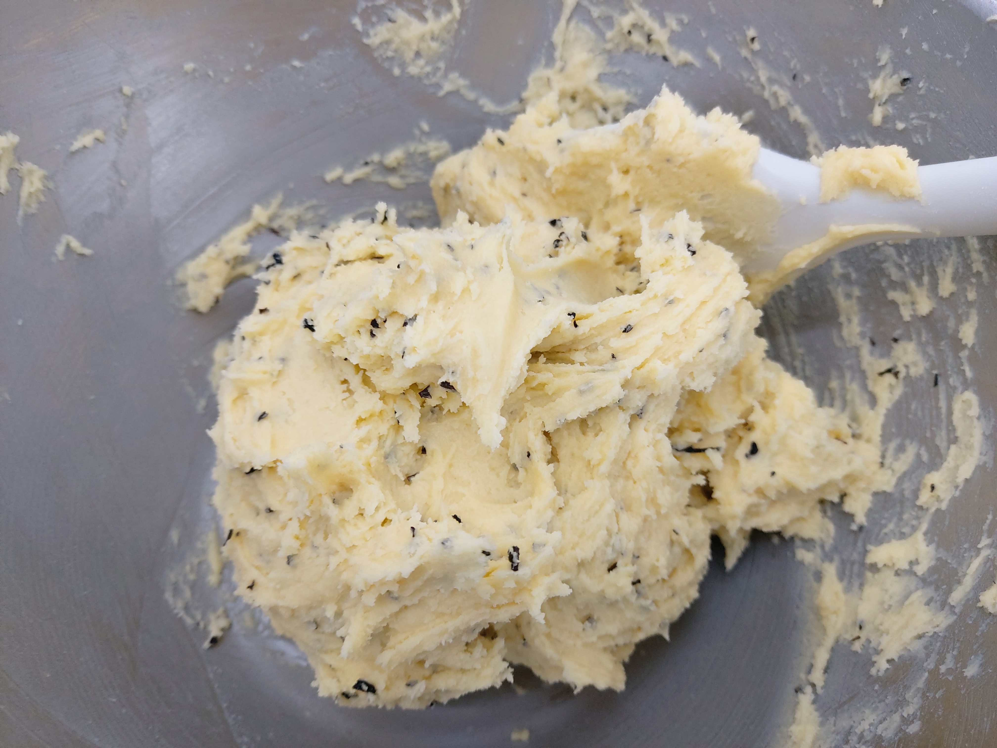 이렇게 반죽을 하면 덩어리진 반죽이 나오는데, 이 쿠키는 얼그레이 쿠키이므로 잘 갈아둔 찻잎도 넣어서 섞어준다. 깨과자가 아니다.