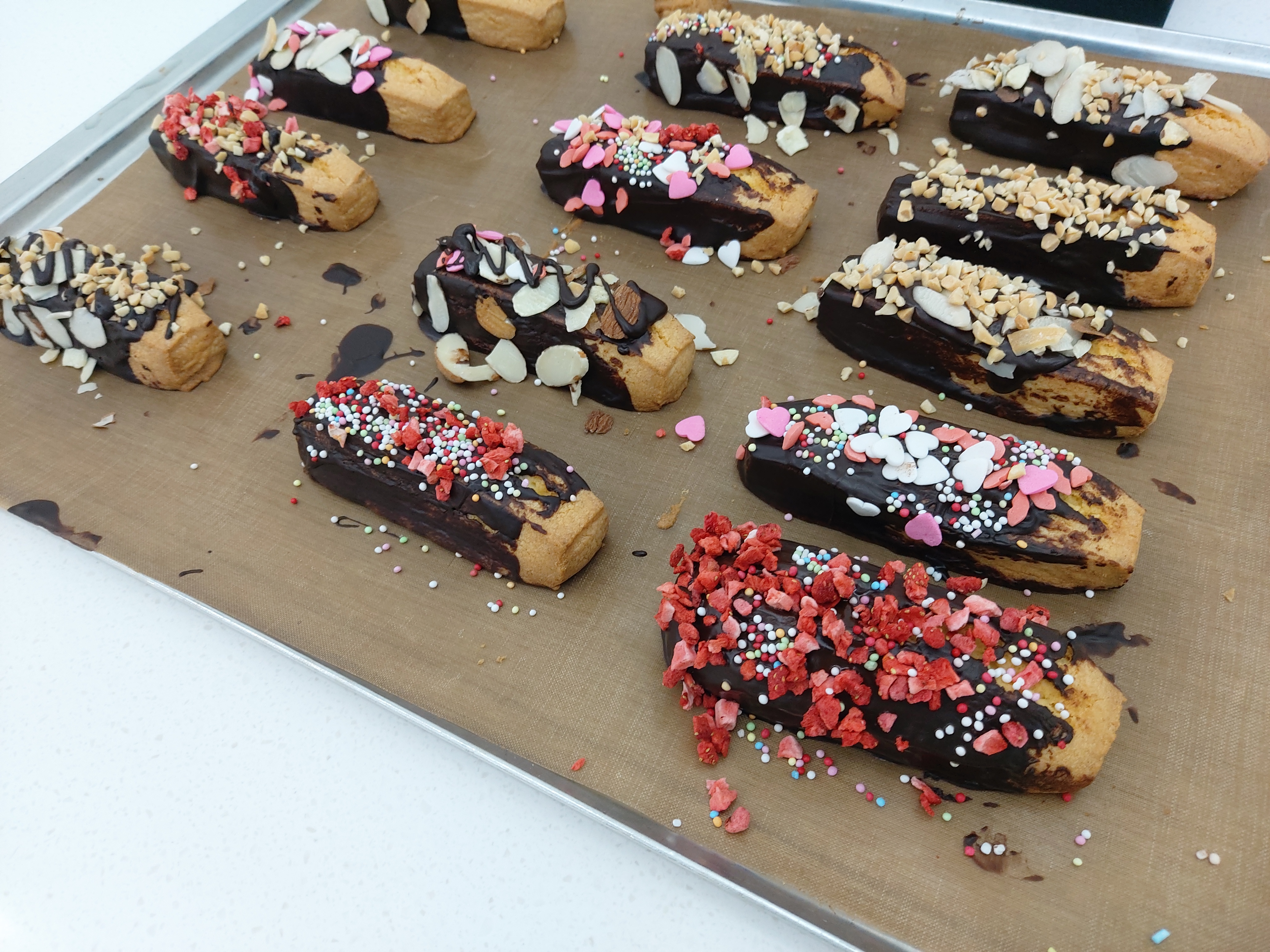 중탕한 초콜렛도 굳을 것 같아서 중간중간 시간을 빼기 어려워보여 장식은 옆에서 내가 취향대로 막 뿌렸다. 최대한 많은 양의 장식을 사용하겠다고 노력했는데 결국 이쪽은 몇가지 장식은 못쓰고 남겼다. (원래 남기라고 가득 재료를 담아준것 같기도 하다)