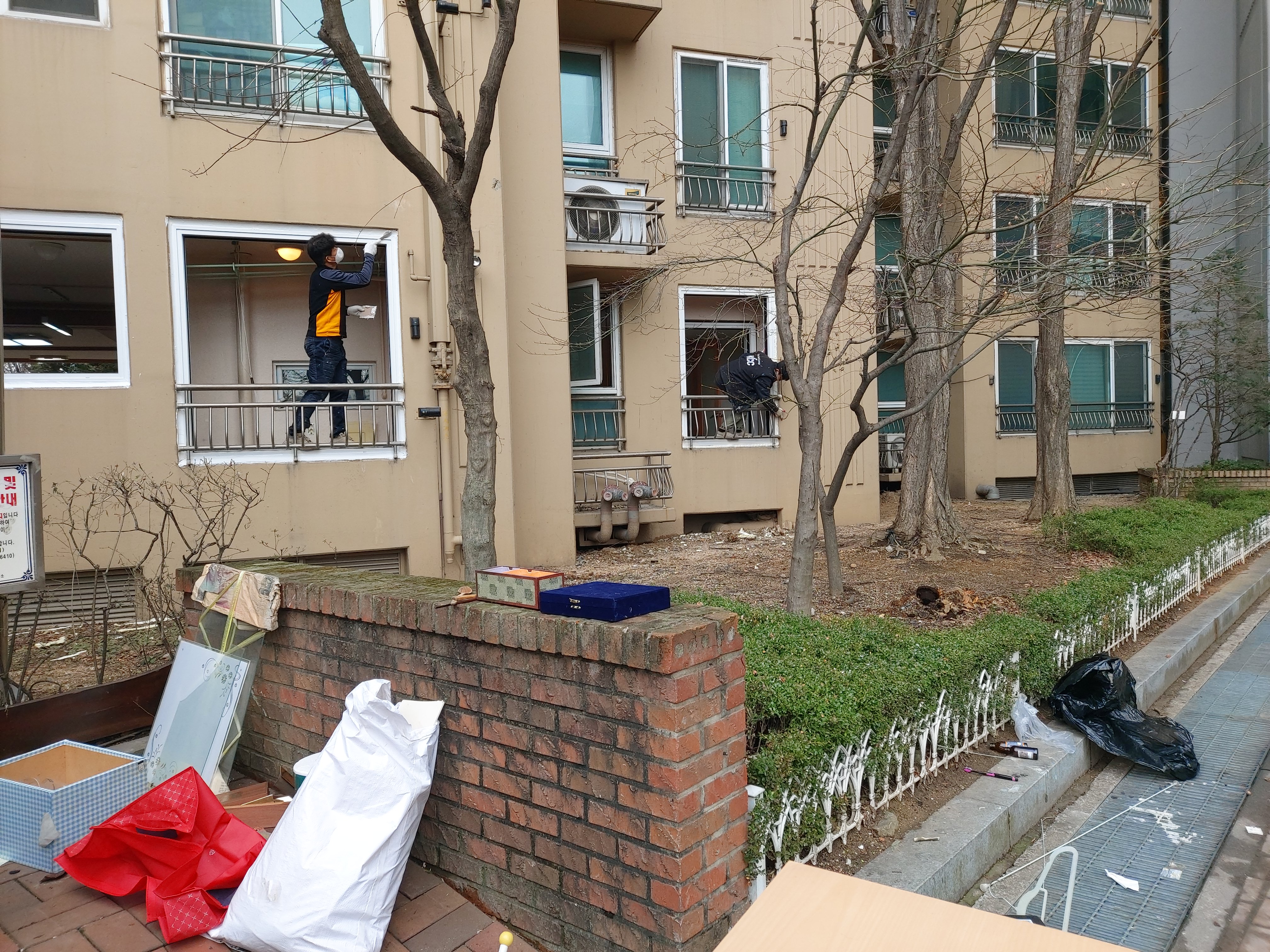 기존 창호를 제거하는 팀과 새로운 창호를 가져다놓는 팀, 이렇게 둘로 나뉘었다. 1층인데 창호 앞쪽은 울타리가 있어서 어떻게 창을 옮길지 일찍 와서 고민하시는 모습도 봤는데 결국 방법을 찾아서 잘 옮겼다. 어떻게든 방법을 찾아주시는 프로분들 존경....