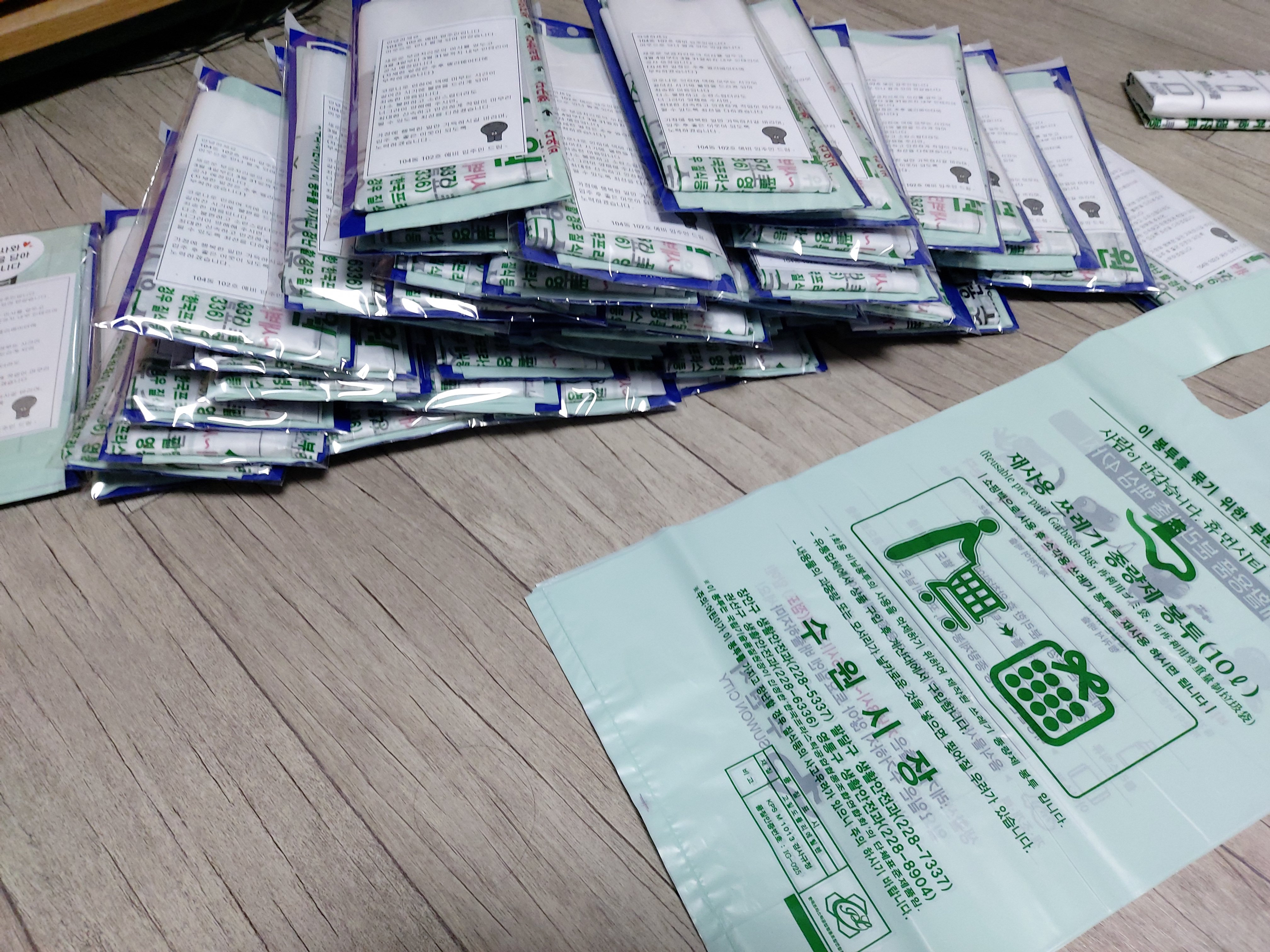 쓰레기봉투와 마스크, 포장봉투를 다 따로 구입해서 일일이 포장했는데 가내수공업을 생각나게 하는 작업이었다... 심지어 세대수도 제법 있어서 포장만 하는데 2시간 정도 걸렸던것 같다.
