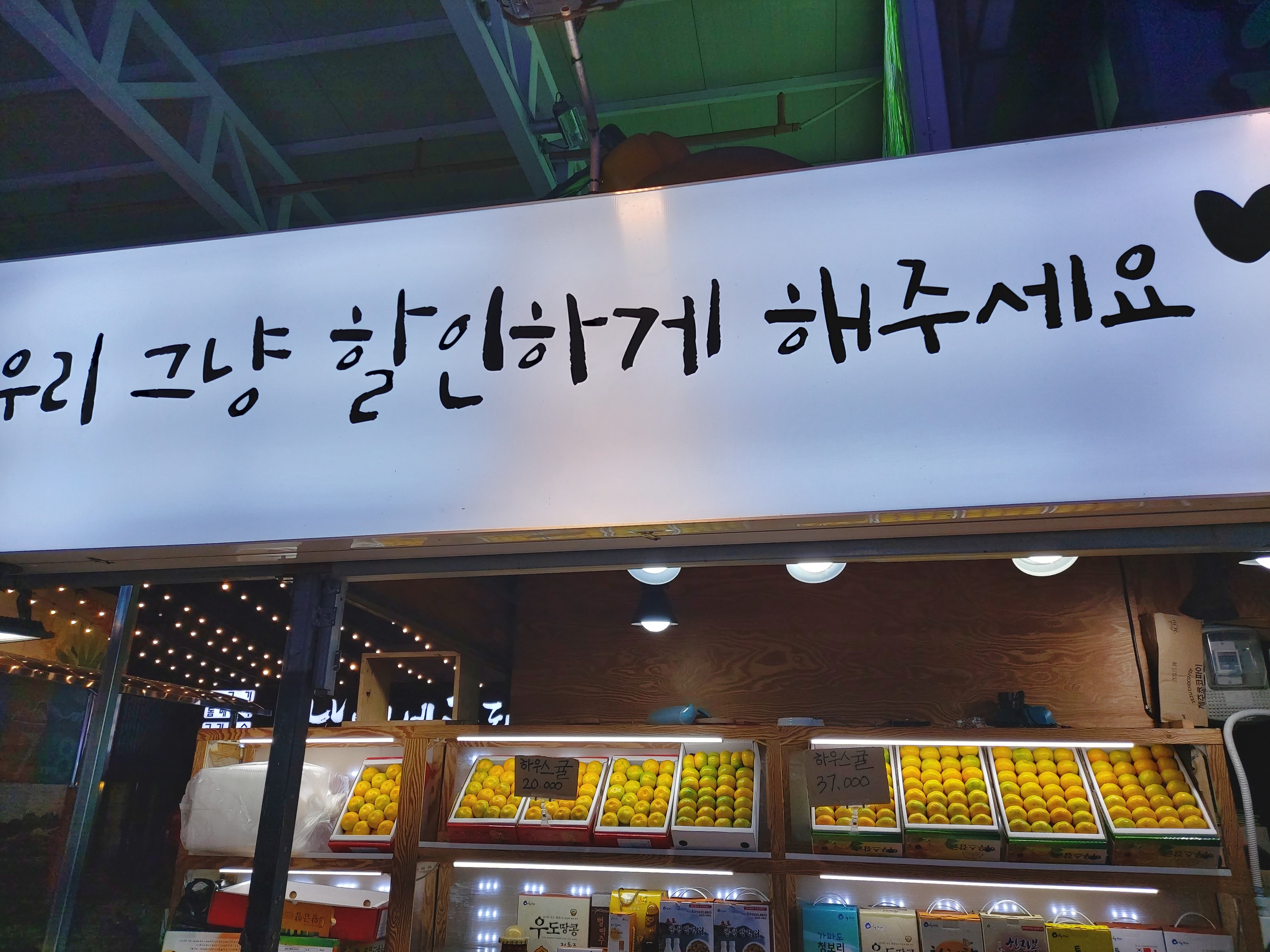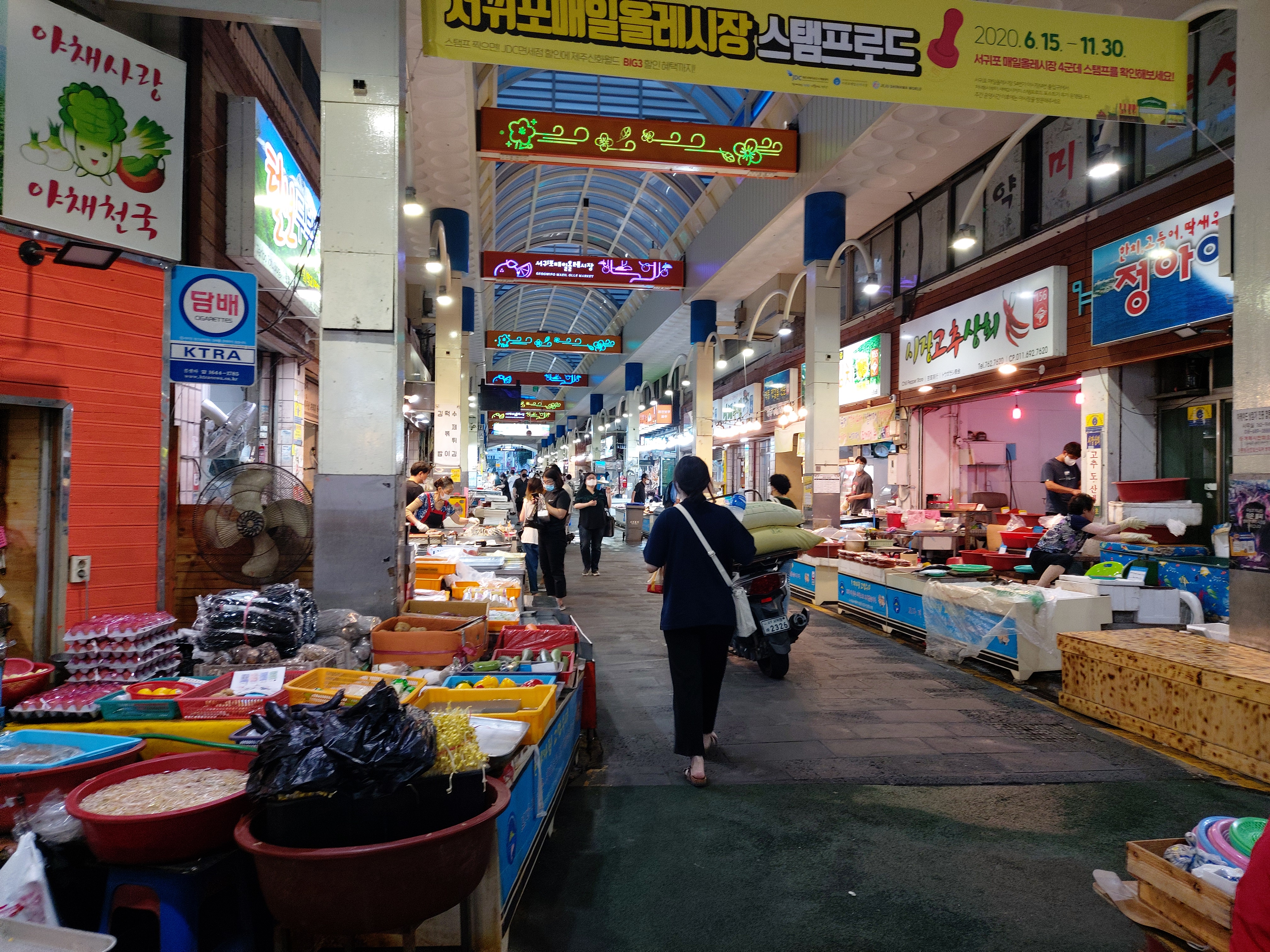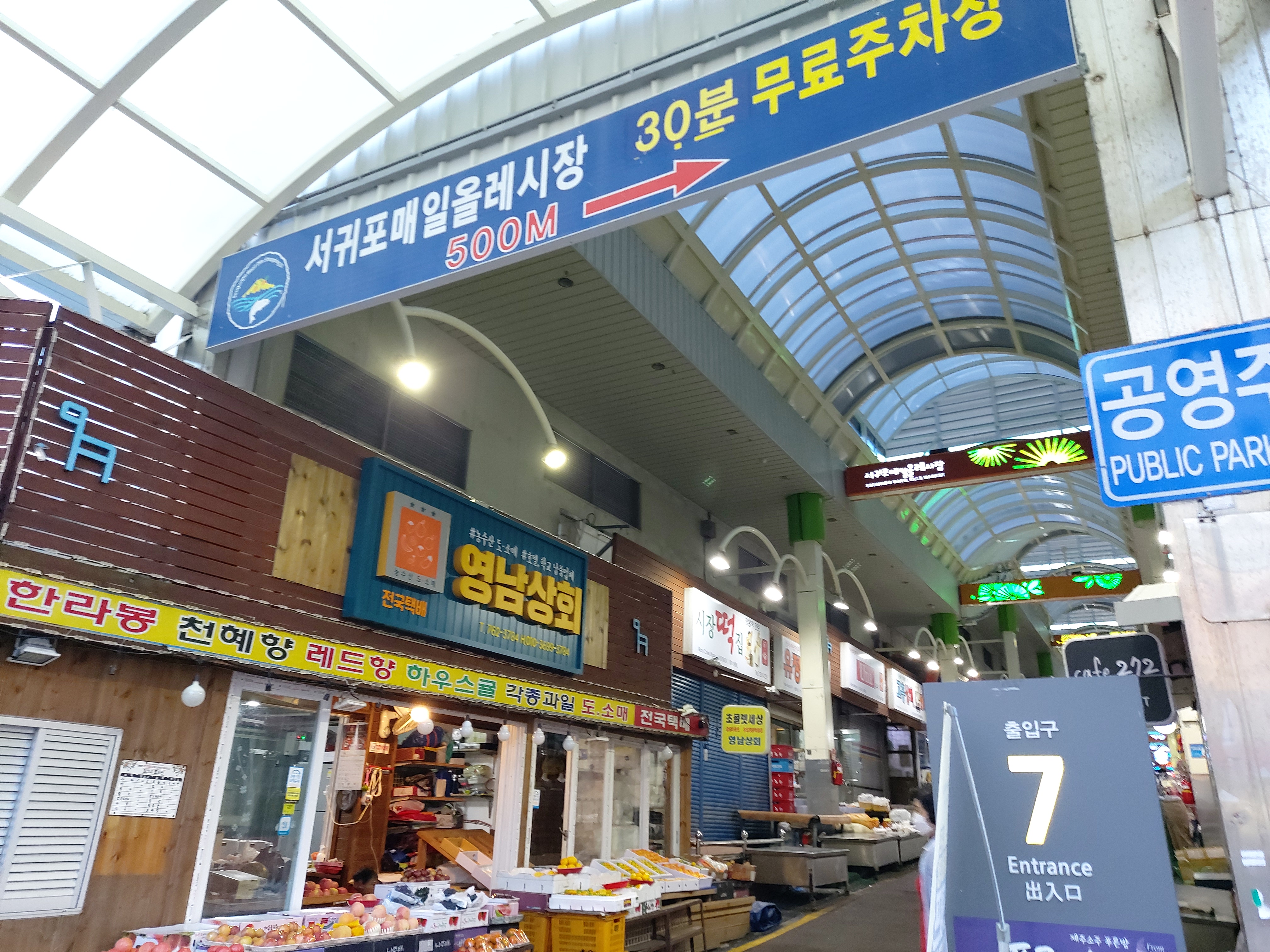 서귀포 올레시장은 매일 운영하는 곳으로 안쪽에는 수산물, 축산물을 포함해 과일이나 기념품까지 정말 다양한 물건들을 팔았다. 하지만 관광객이 많이 오는 건지 어느 길은 사람이 정말 없고 회 포장해서 파는곳은 끔찍하게 사람이 많았다.