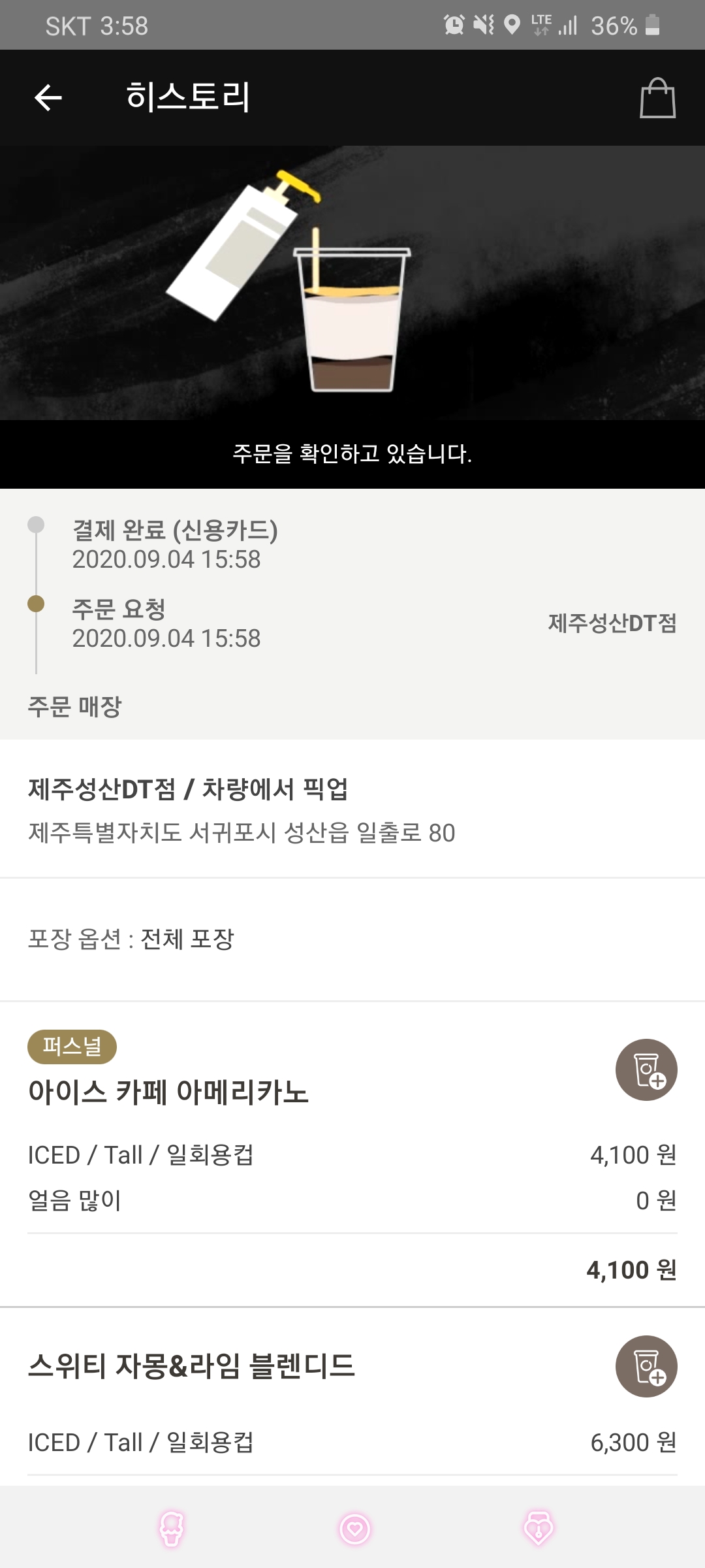 16:00 정도 나오다가 제주도에서만 판다는 스벅 메뉴를 맛보기 위해 스벅 DT 이용