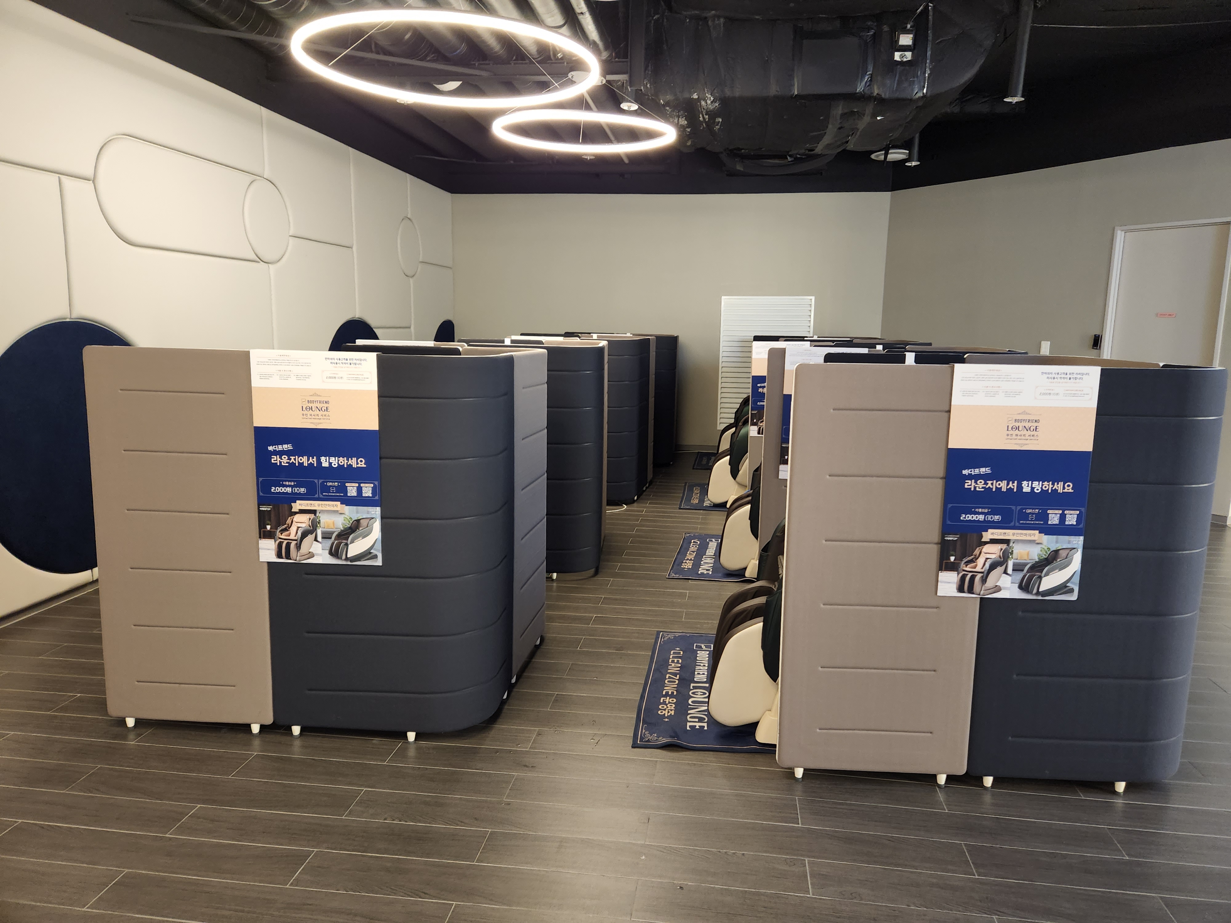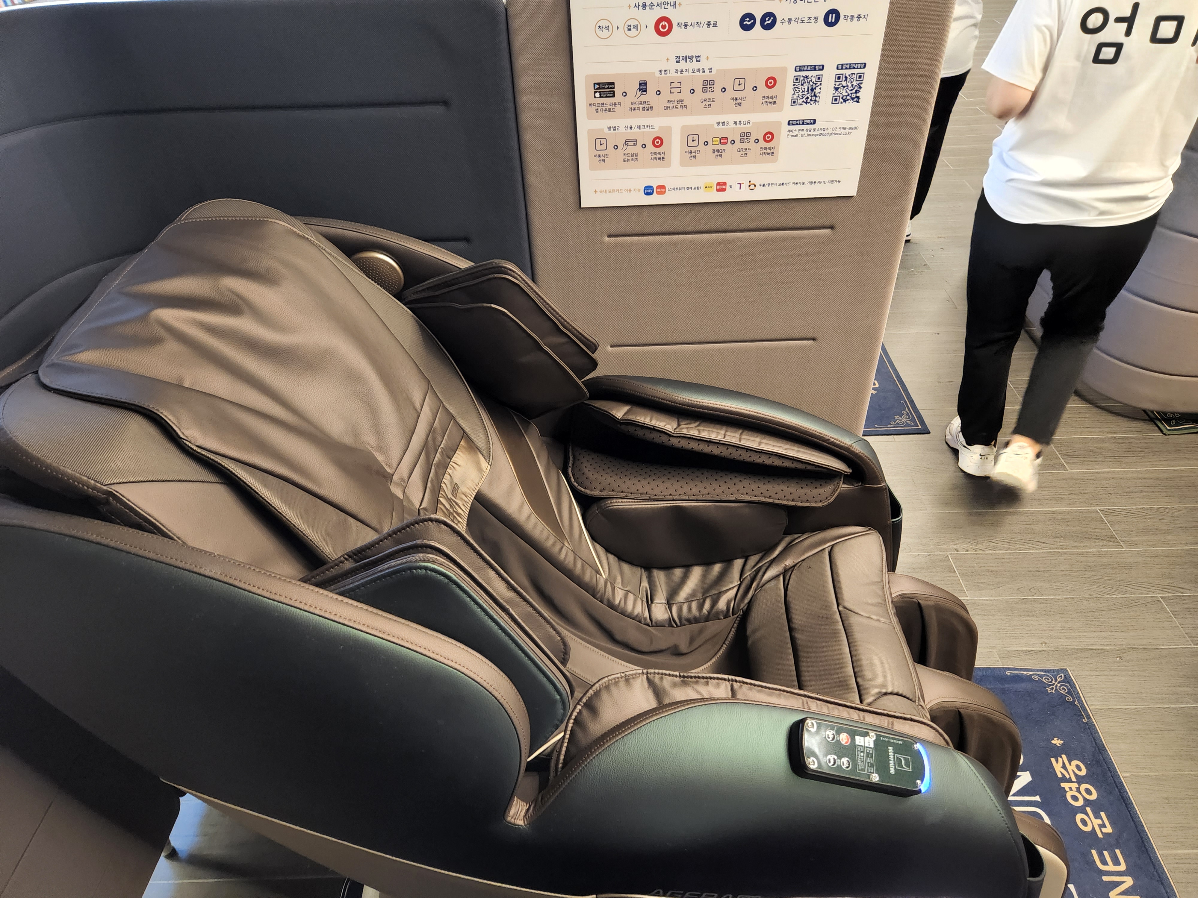 동생과 내가 눈독을 들인 바디프렌드 라운지. 안마의자가 여러개 놓여있었고 라운지 앱 또는 현장의 기기를 이용하여 결제하는 방식이었는데, QR코드를 통해 앱을 다운받아서 사용하는게 제일 편했다. 바디프렌드 앱을 받으면 무료쿠폰을 줘서 그걸 이용하는 방법도 있던 것 같은데 나는 그냥 2천원을 내고 사용했다.