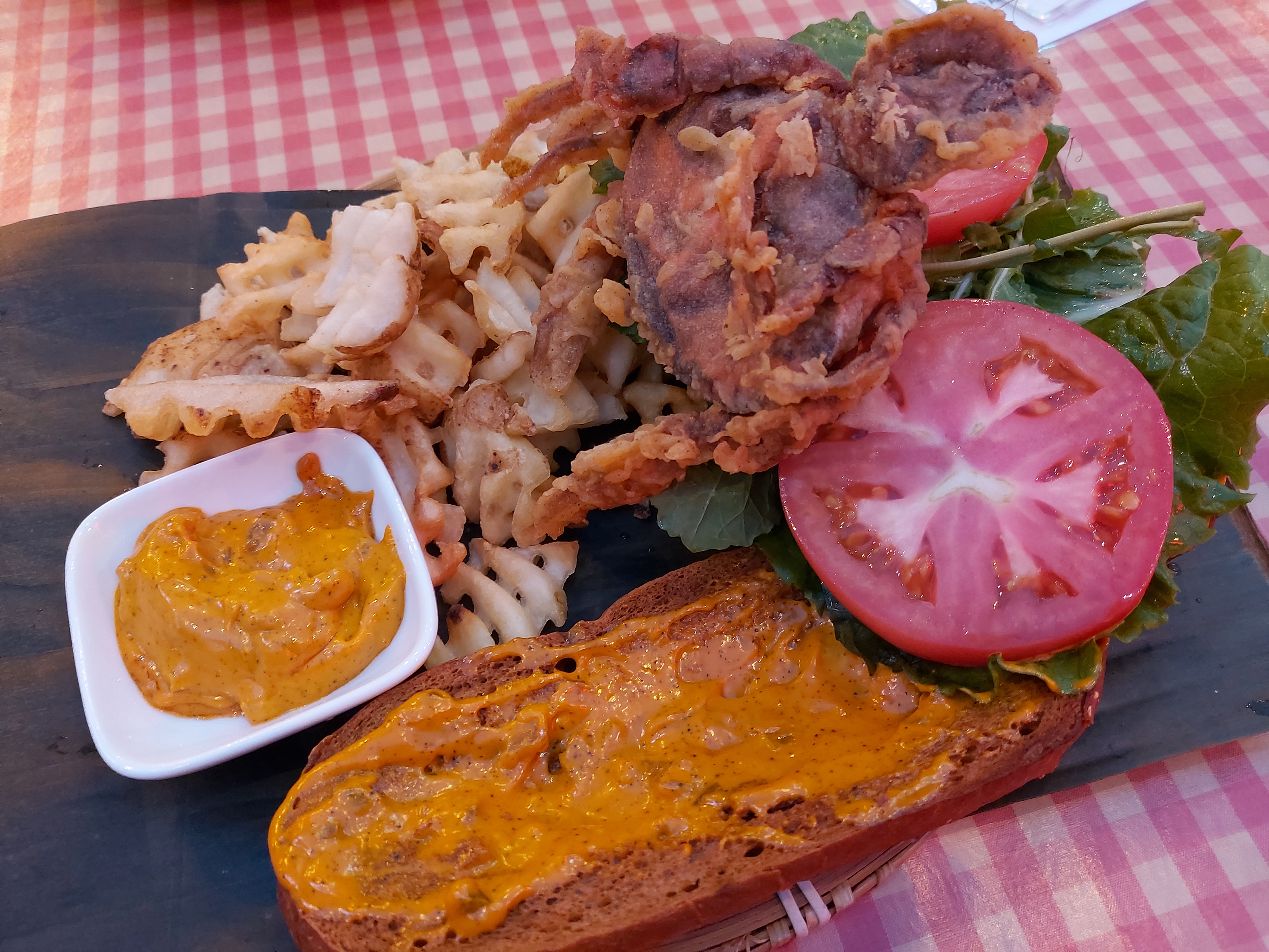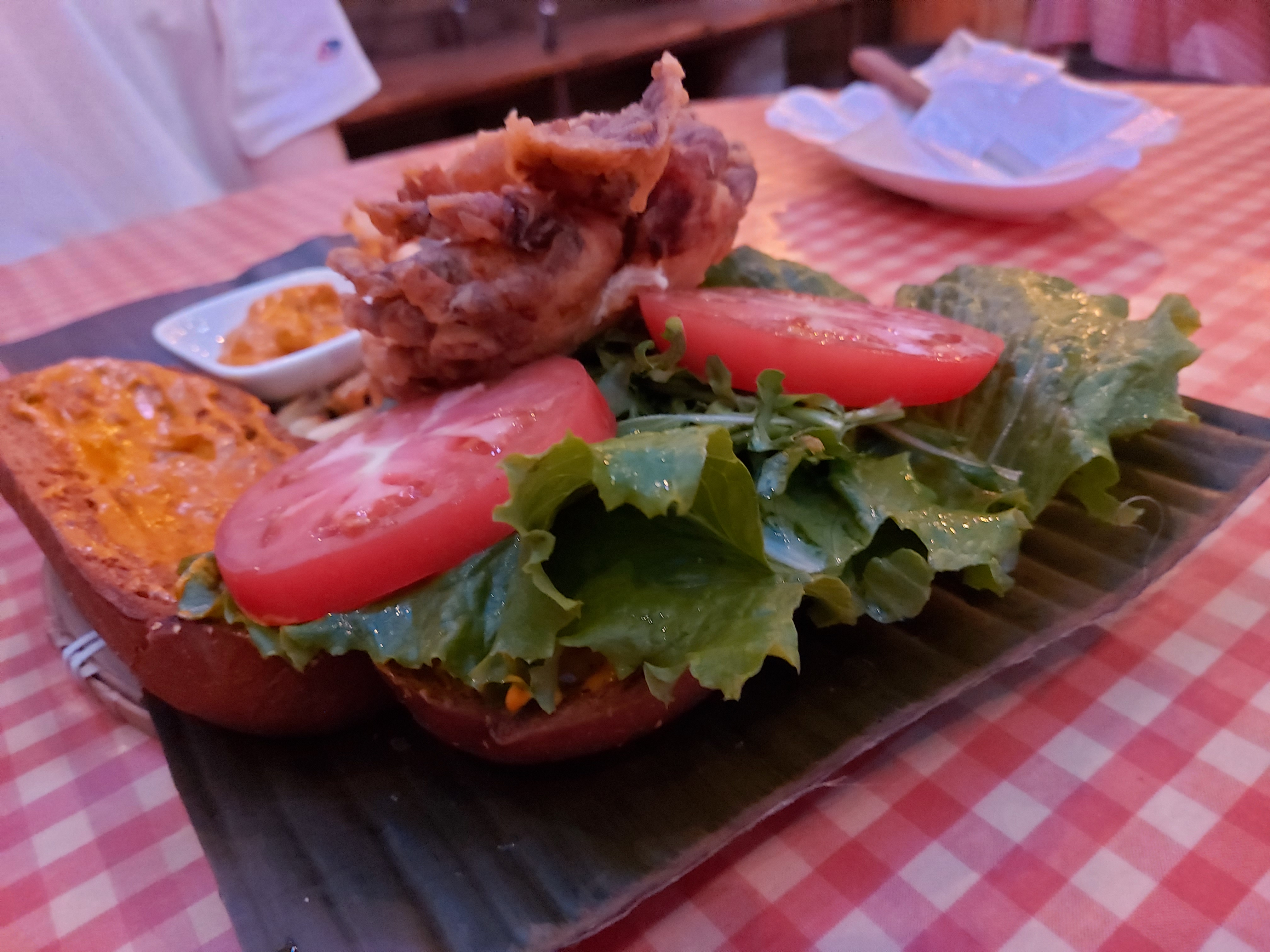 게살커리버거였나? 게살을 통째로 튀긴듯한 비주얼에 오픈 샌드위치 형식으로 나오는데 위에 얹을 빵은 옆에 같이 놓여져있다. 빵에는 카레크림 소스가 있었는데 이게 진짜 만능 소스(?) 같은 느낌으로 느끼할 수 있는 게살 튀김의 맛도 잡아주고 샌드위치랑도 잘 어울리게 만들어줬다. 살짝 매콤한 편이긴 한데 엄청 매운건 아니고 크림의 고소한 맛도 같이 있어서 먹을때도 맛있고 먹고나서도 생각나는 맛이다.