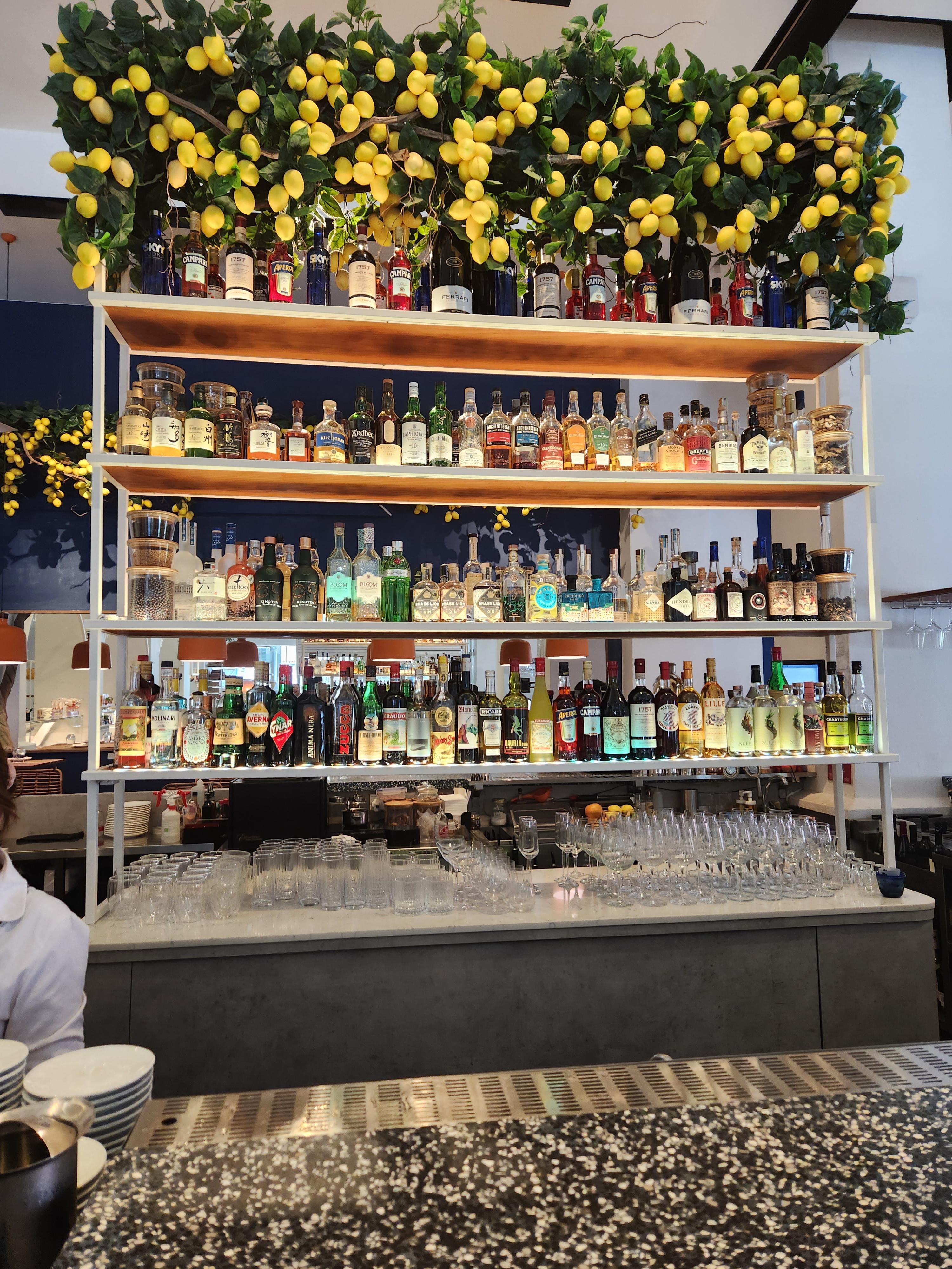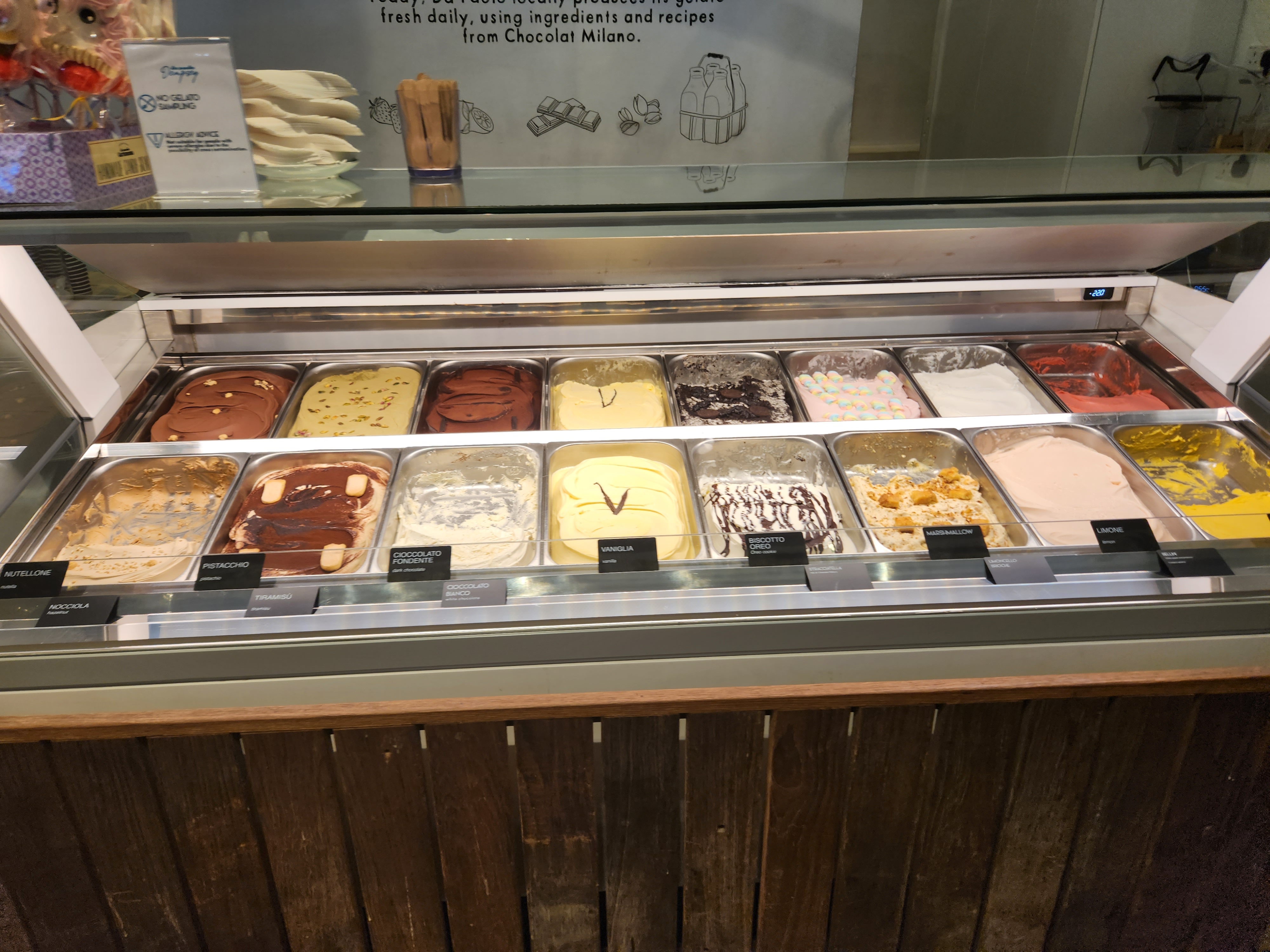 어디 앉을까 돌아보면서 슬그머니 구경한 가게에는 다양한 술이 꽉꽉 채워진 바도 있었고, 화려한 젤라또가 채워진 아이스크림 쇼케이스도 있었다.