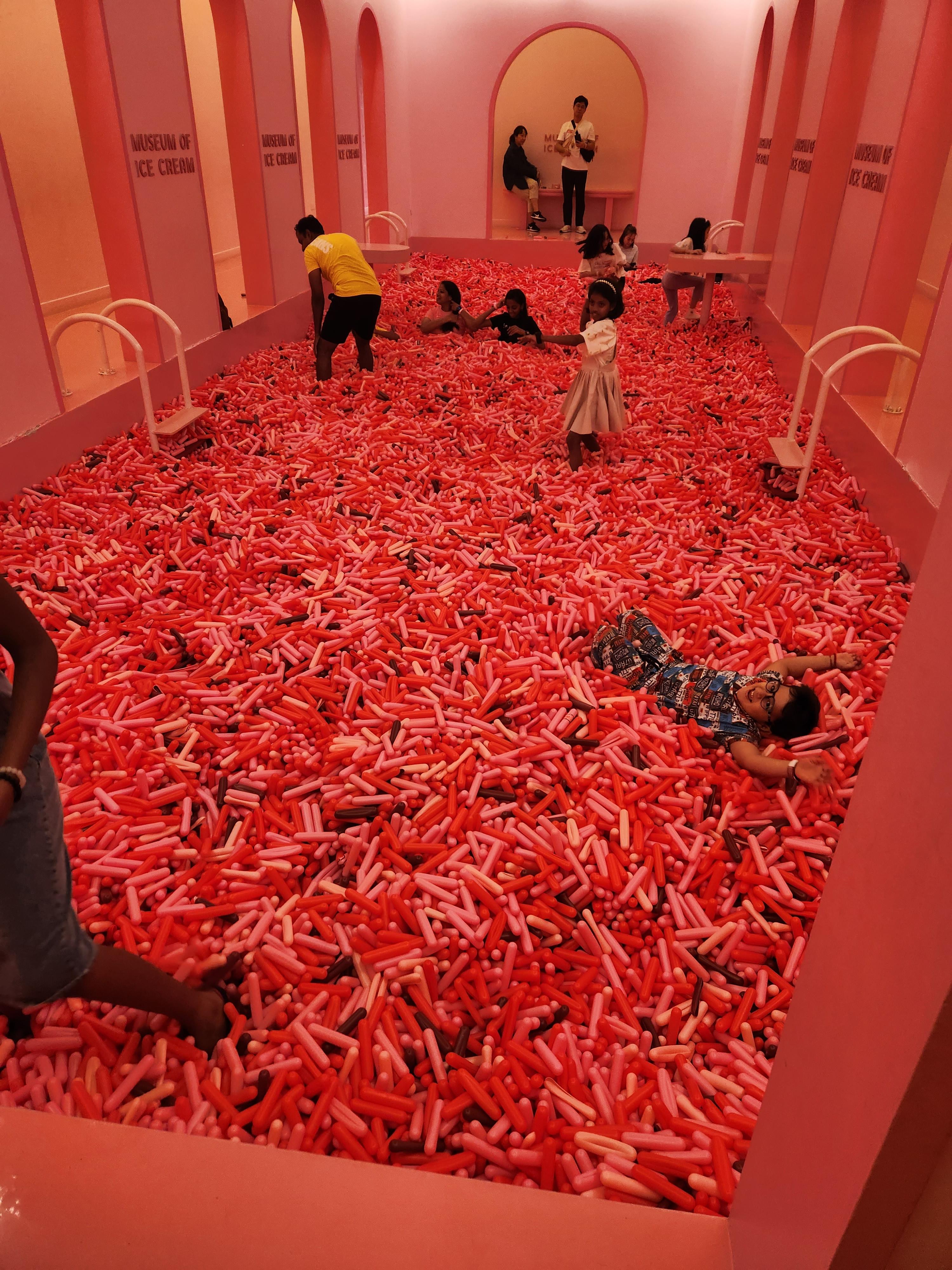 위 아이스크림 존을 나오면 이제 더 이상 아이스크림을 먹을 수 있는 곳은 없고, 마지막으로 아이스크림 막대 모양의 볼이 가득한 풀에서 뛰어노는 것만 남았다. 여기에서는 악세서리를 잃어버리기 쉬우니 주의하라는 경고 문구와 함께 뛰어노는 아이들이 있었다. 입구에 가방이나 짐을 놔둘 수 있는 칸이 있어서 잠깐 짐을 놔두고 들어가서 노는 것도 괜찮다. 특히 핸드폰은 들고 들어가서 놓치면 찾기 매우 힘드니 조심해야 한다.