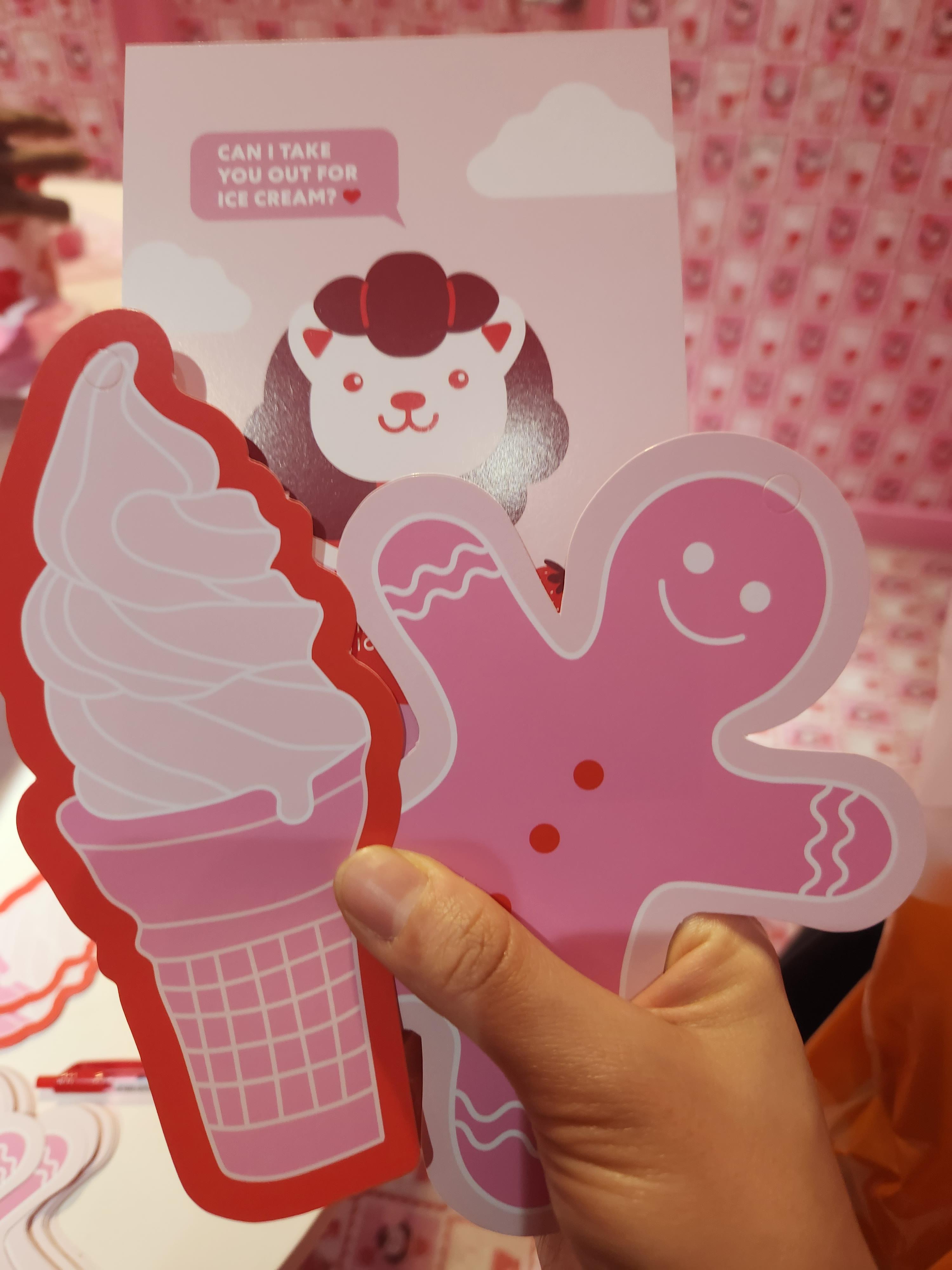 아이스크림을 먹는 장소 주변에는 분홍색으로 잘 꾸며진 서핑보드나 모래성 같은 곳을 볼 수도 있었는데 알파벳 블럭을 움직여 원하는 글을 쓸 수 있는 공간도 있었다.