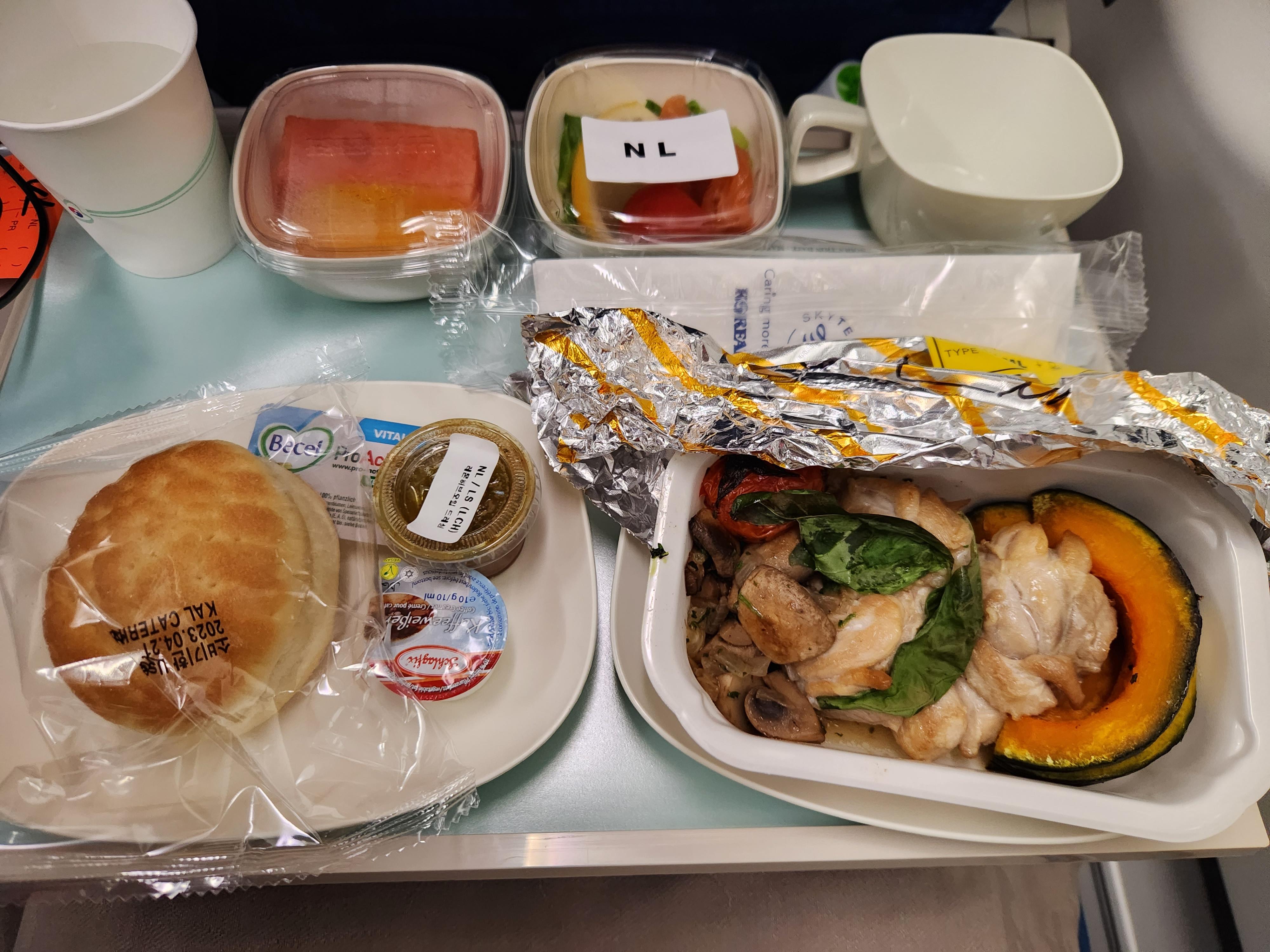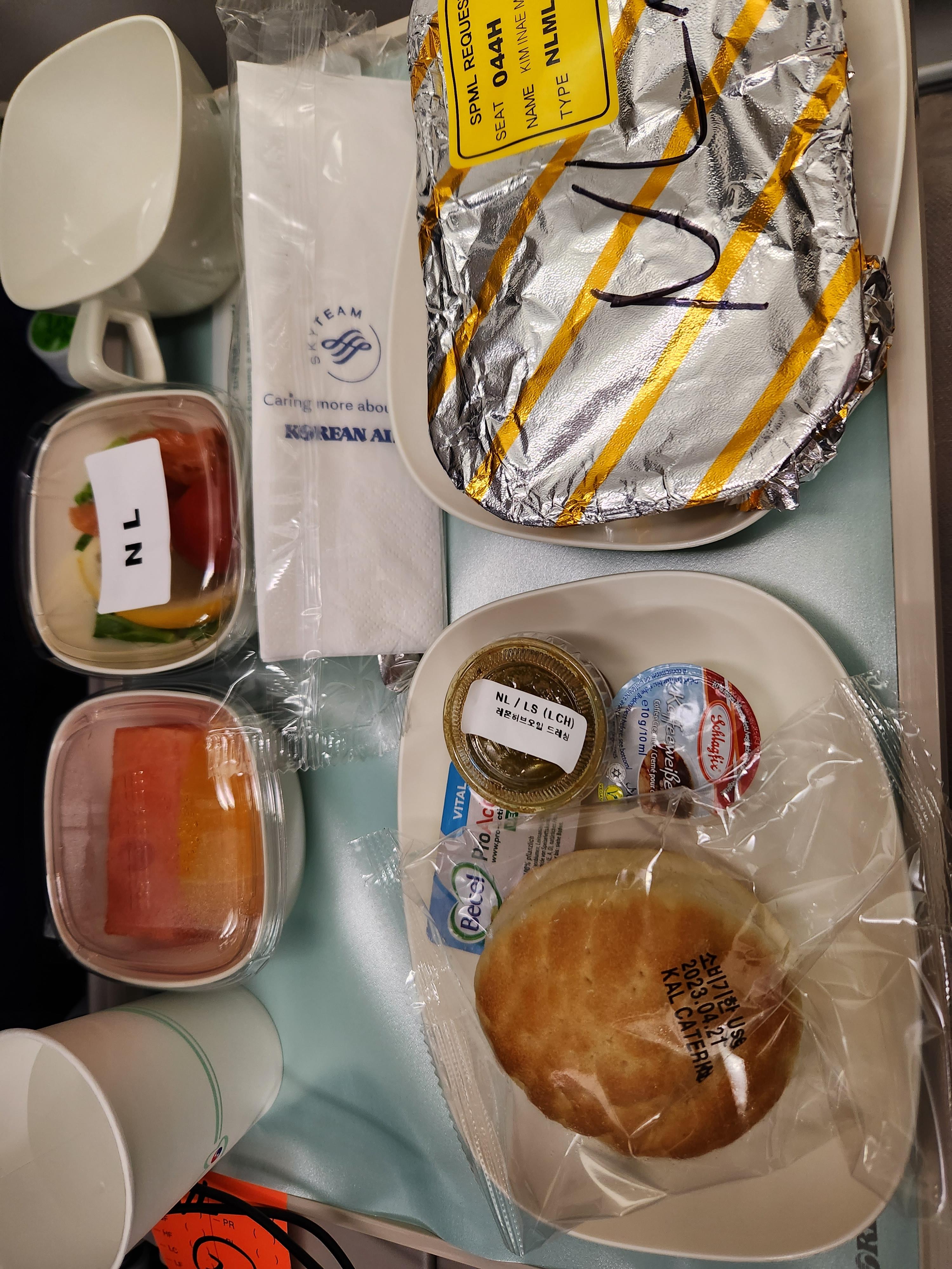싱가포르로 가는길에 주문한 특별기내식은 NLML.... 나트륨 로우? 저염식이었던 것 같다. 4월에 간거라 정확히 기억이 안난다. 먹다보니 특별기내식은 대충 다 비슷한 것 같기도 하다. 대충 다 간이 심심하고 깔끔하니 다이어트 식단 같은게...