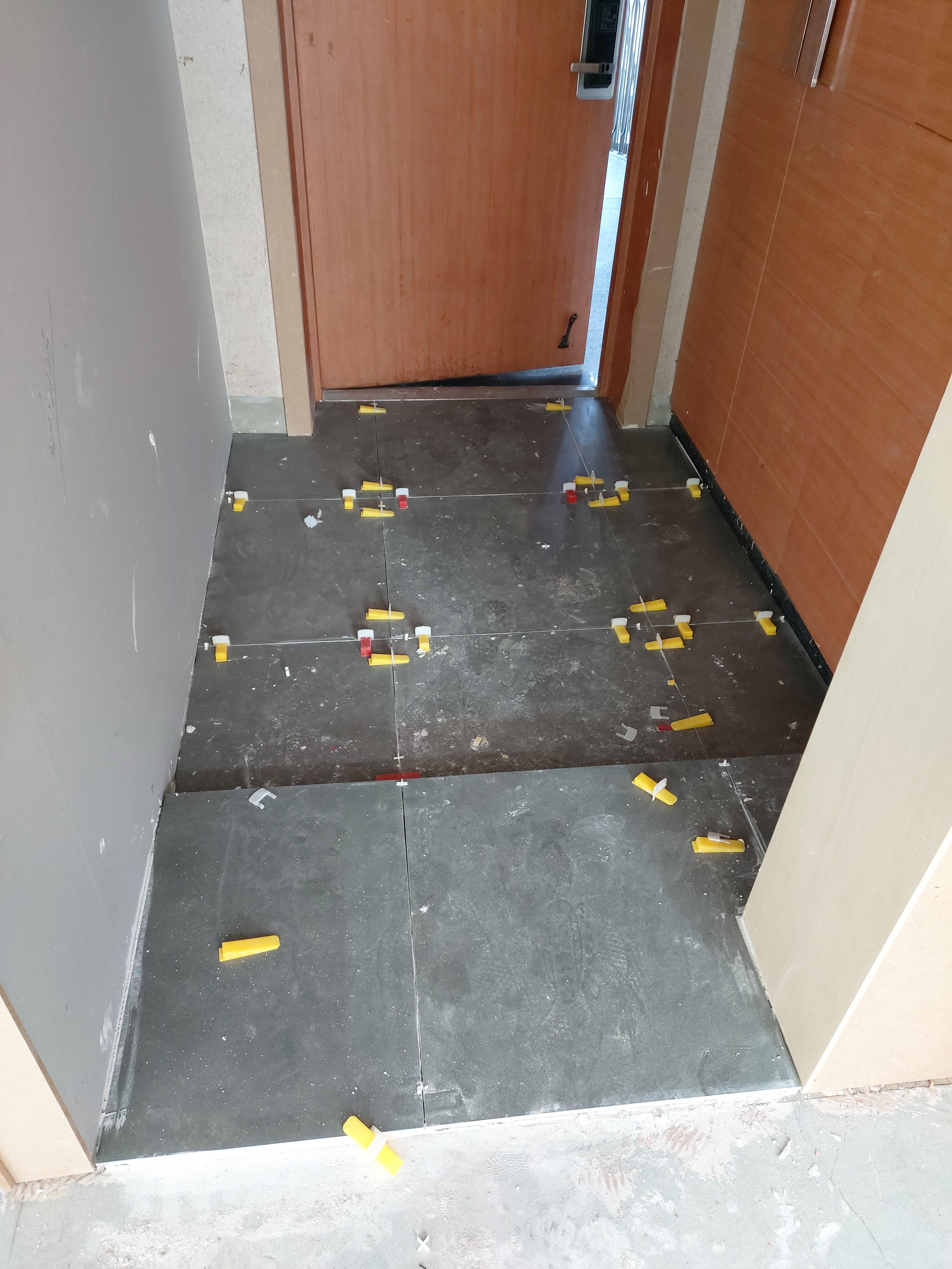 타일을 수평에 맞게 올려두고 메지도 잘 채우고 한동안 지나다닐때 조심하라고 박스도 올려놨다. (가급적 하루는 다니지 말라고 해서 다음날 하루는 안감) 처음 현관 타일을 깔때는 그냥 입구까지 다 깔고 결과물을 보니 타일이 너무 예뻐서 맘에 들어하며 흡족해했다. 하지만 나중에 마루를 깔기 전에 타일과 마루의 높이차이 때문에 중문을 설치하고나면 중간에 단차가 생길 것 같은데 단차가 발로 밟았을때 느껴질 정도가 될 거라고 해서 아쉽게도 예쁜 타일은 버리고 턱 위쪽은 마루를 다시 깔았다.