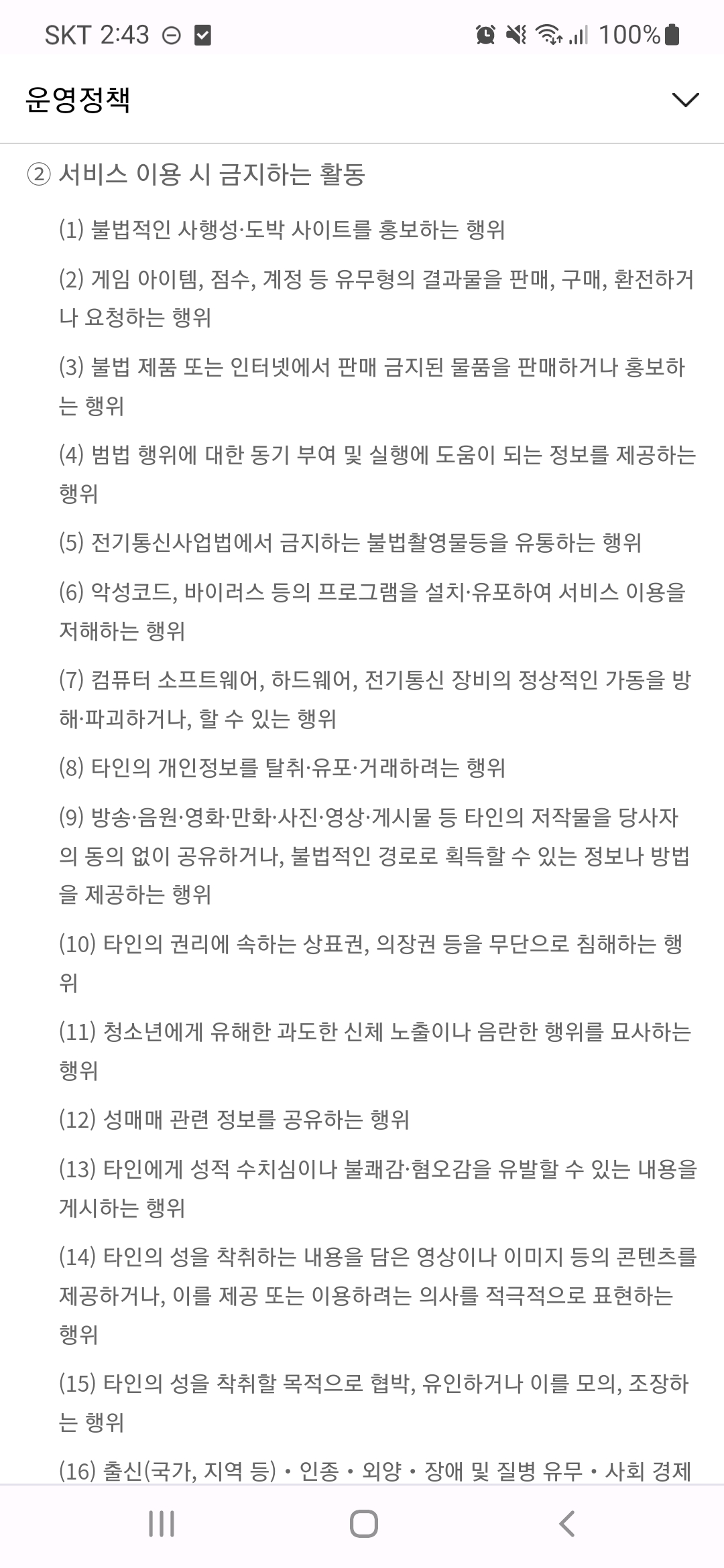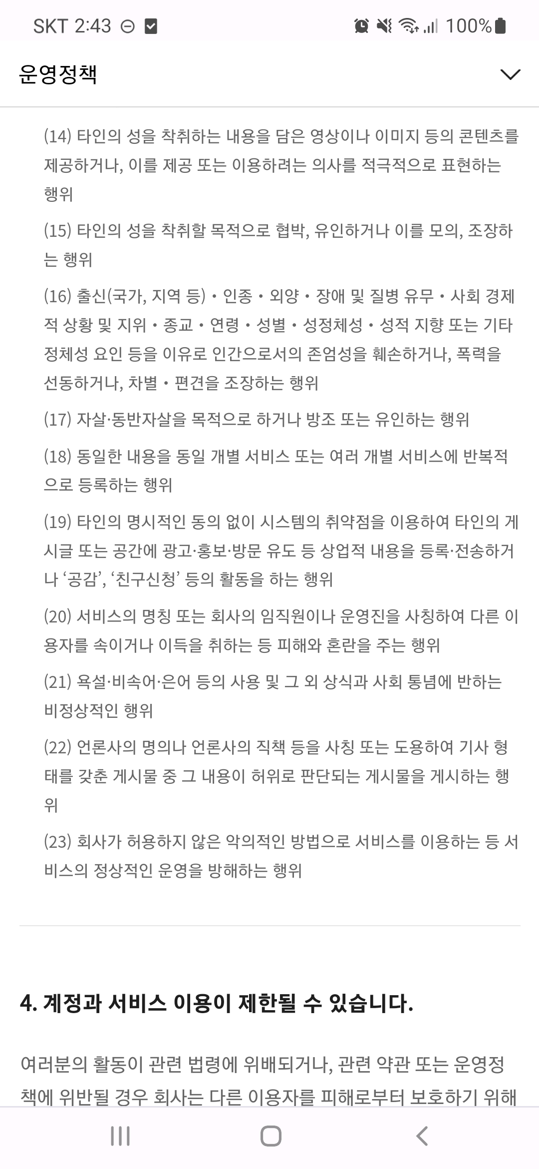 내가 의료법(의료광고)을 위반했다고? 해서 운영정책에 그런 내용이 있나도 찾아봤다. 그런데 운영 정책에는 의료법 같은 얘기는 언급도 되어있지 않았다. 적어도 저런걸로 뜬금없이 제한할거면 운영정책에도 그런 내용이 써있어야 하지 않나....