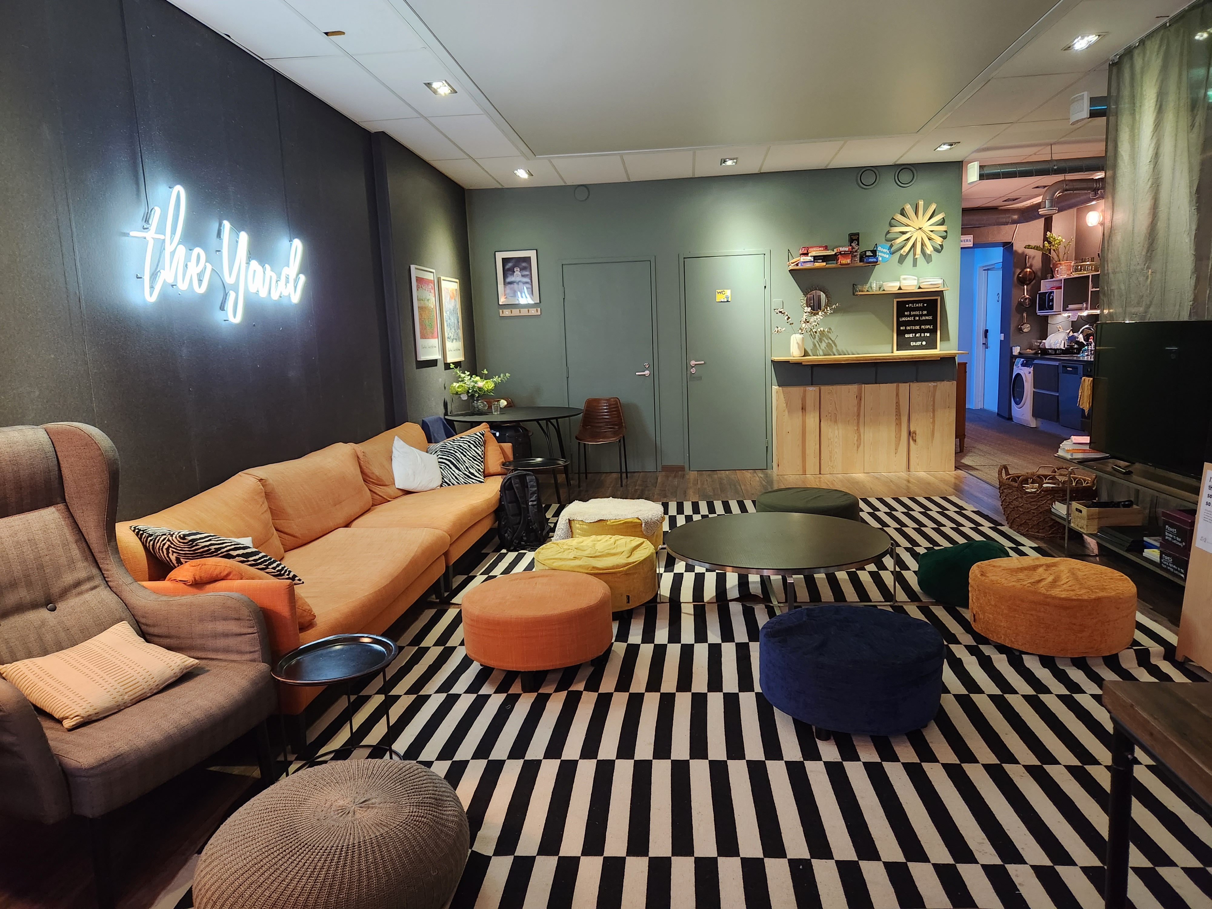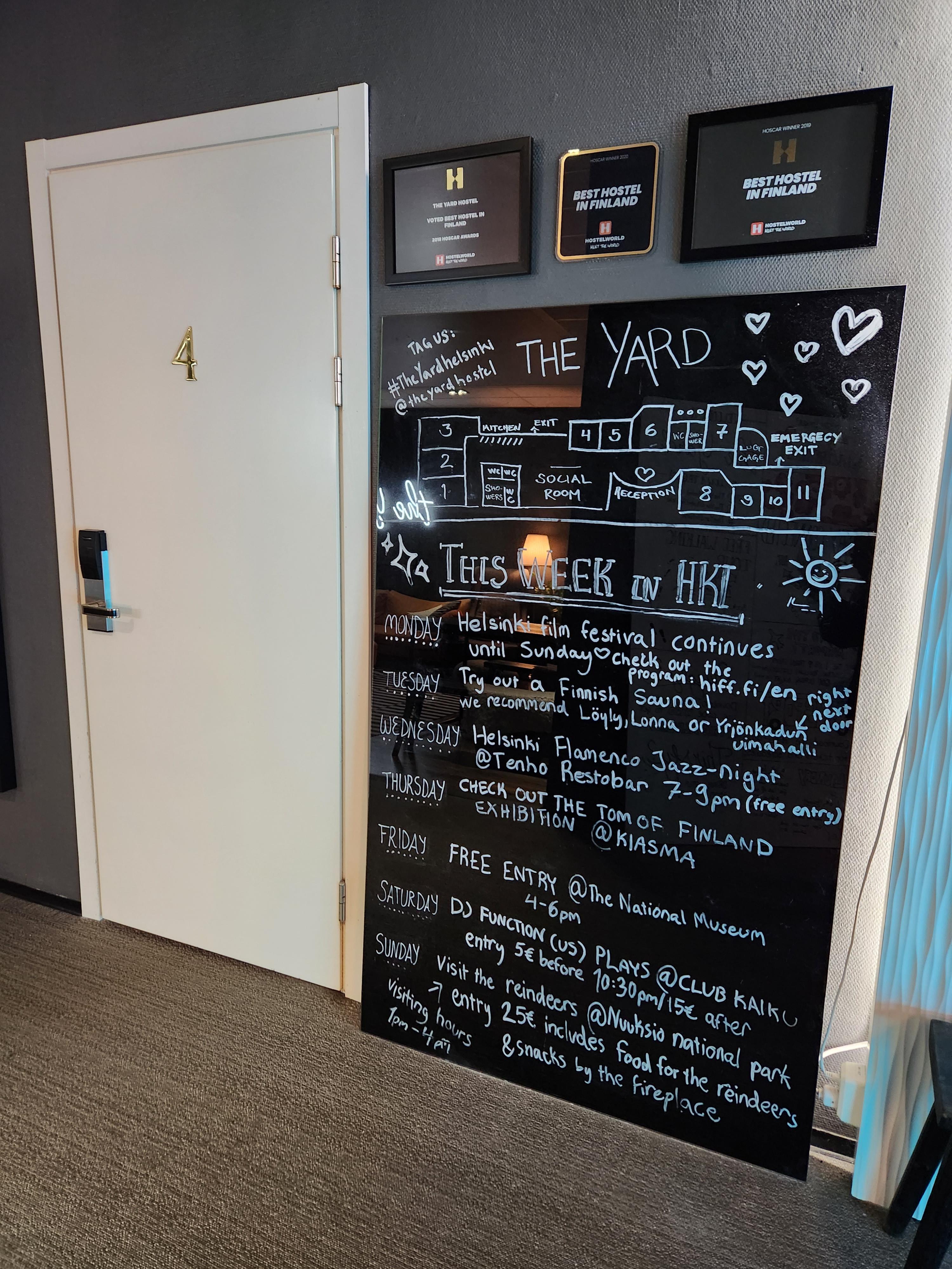 호스텔을 예약하면 어느 문으로 들어오라는 것도 안내해주고 현관 비밀번호 등도 함께 소개하기 때문에 이를 따라가기만 하면 된다. 간판에 더 야드 호스텔이 써있진 않지만 사진의 건물로 들어가면 엘레베이터에서 호스텔 이름을 찾을 수 있었다.