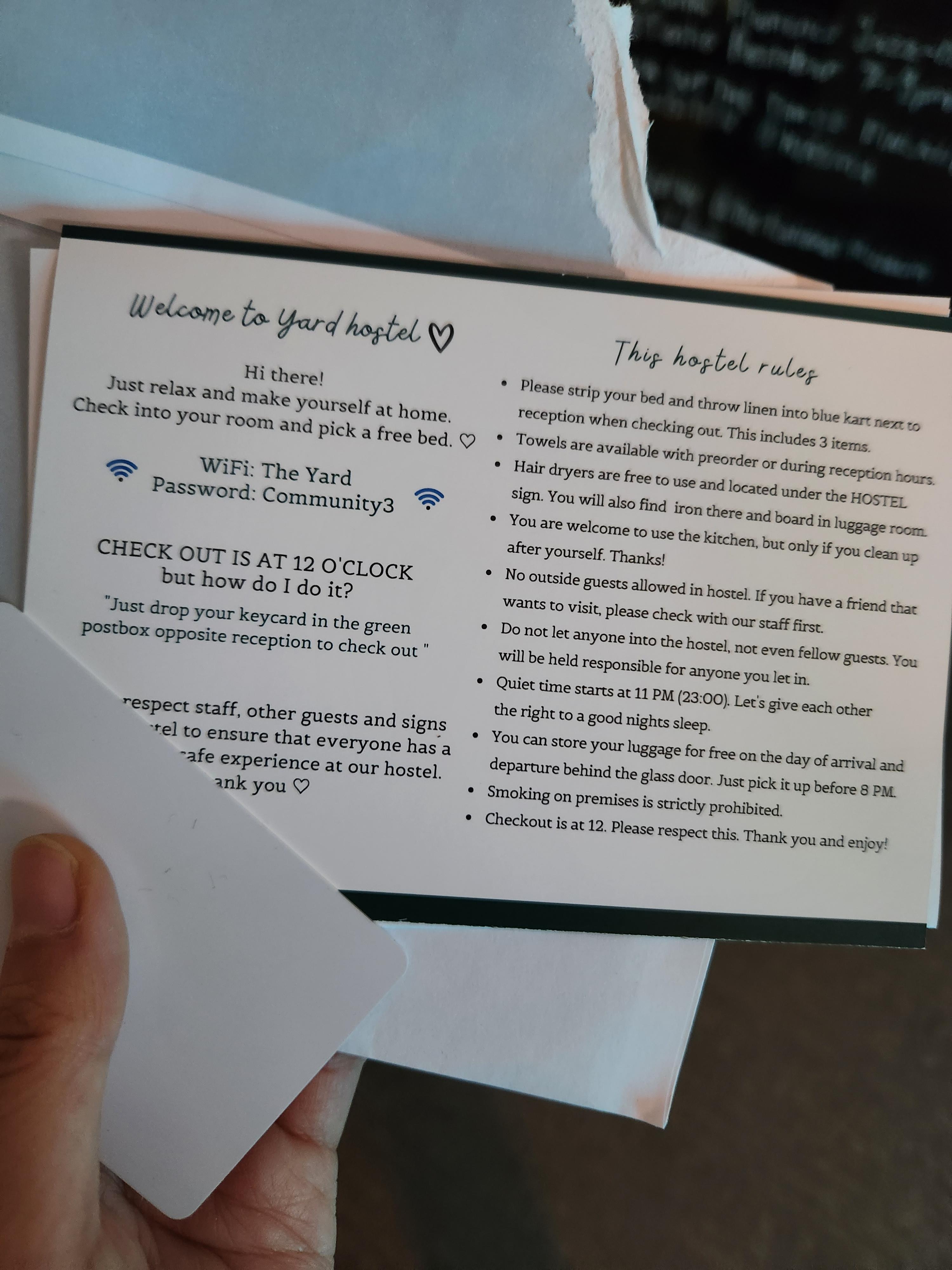 데스크에 직원이 있는 시간이면 직원이 직접 안내해주지만 내가 도착하는 시간은 너무 늦다보니 리셉션 데스크에 내 이름으로 된 봉투에 키와 안내문이 들어있는 걸 찾을 수 있었다. 이걸로 방에 들어가서 후다닥 잘 수 있었다.