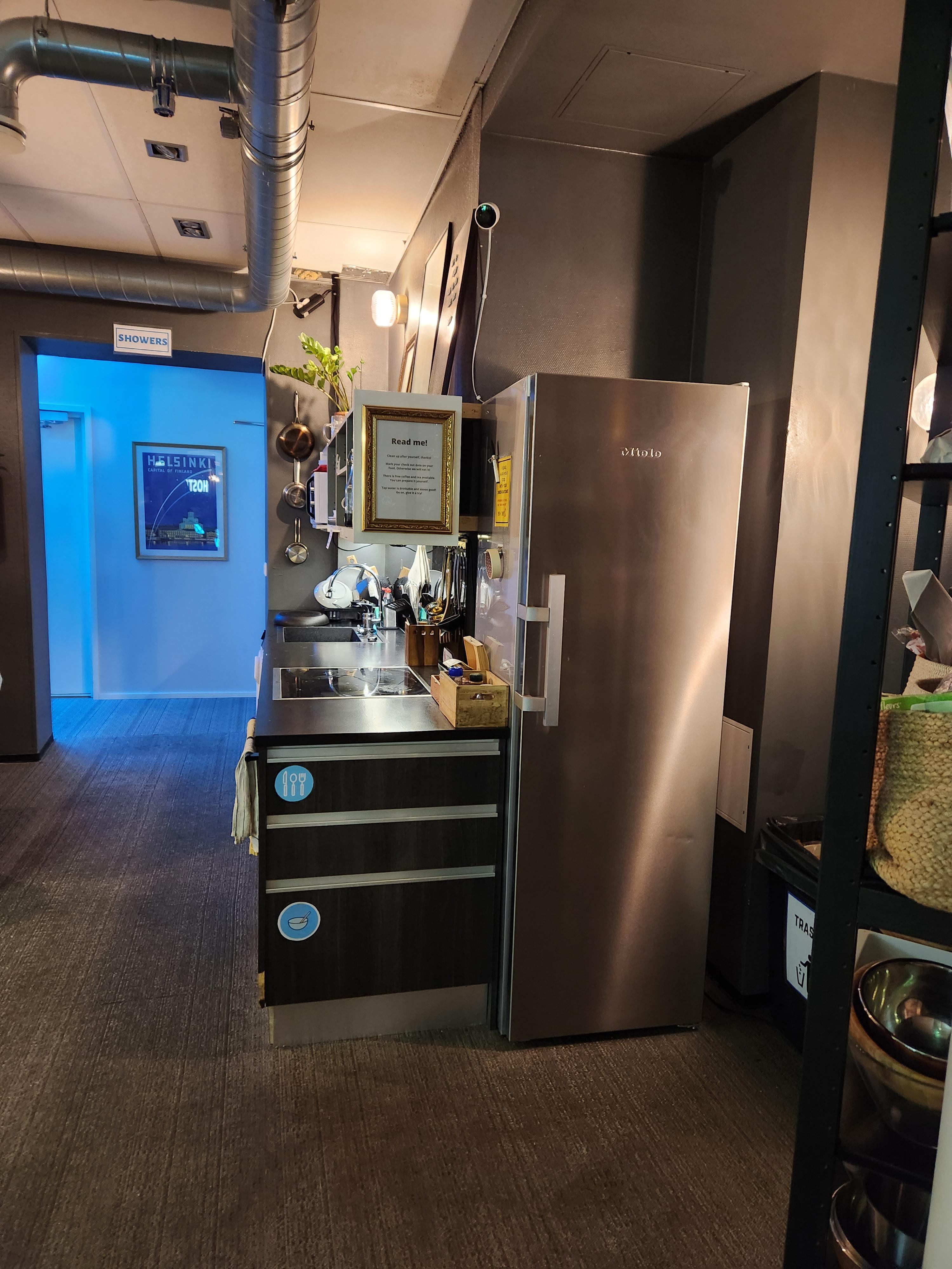 작은 주방에는 한번씩 요리를 해먹는 사람들도 볼 수 있었다. 냉장고에는 각자가 근처 마트에서 사온 음식들을 가져다놓는데, 누가 가져다 둔 것인지 정리를 위해 이름과 날짜를 표기해두도록 냉장고 옆에 펜과 종이 테이프가 준비되어있다.